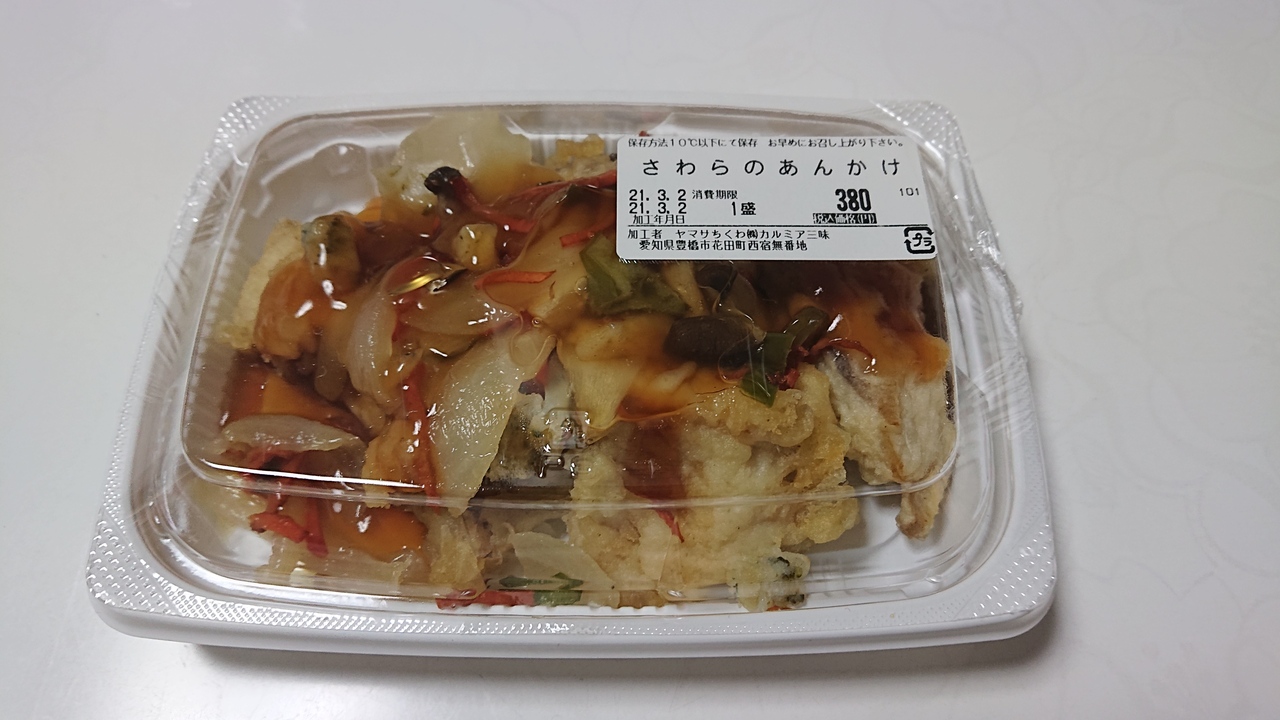 豊橋駅の商業施設と言ったらカルミアです。そのカルミアの、フードマーケットに立地しているのが、こちらのお店「三味」さんです。今回は、さわらのあんかけ、を購入しました。揚げさわらに、あんがかけられた品物。食べやすいサイズになっているのが良かったです。