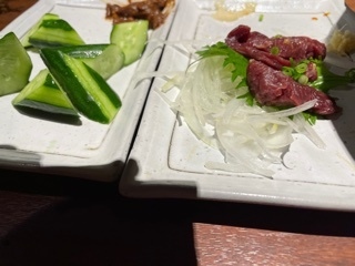 今回は、刺身盛り・馬刺し・梅キュウリ・エイヒレの炙り・イカゴロ焼き・ロース牛の焼き物を注文。