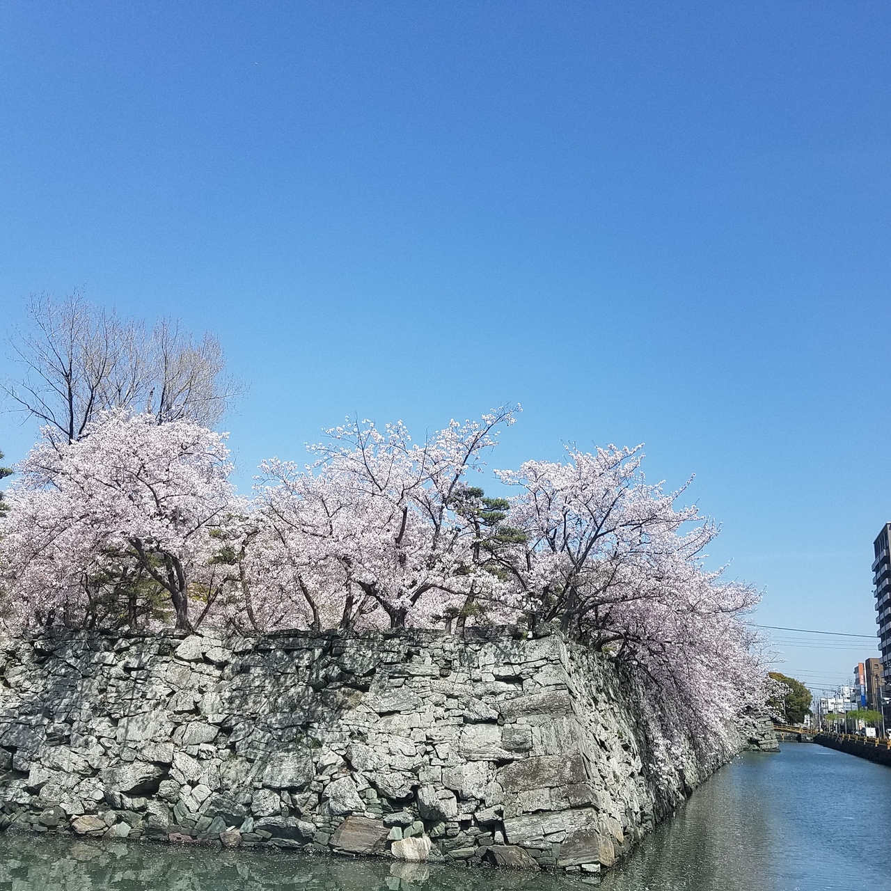桜の名所ということで平日の午後に伺いました。桜は満開で、至るところに咲き乱れ本当に綺麗でした。石垣からはみ出る桜も圧巻でした。