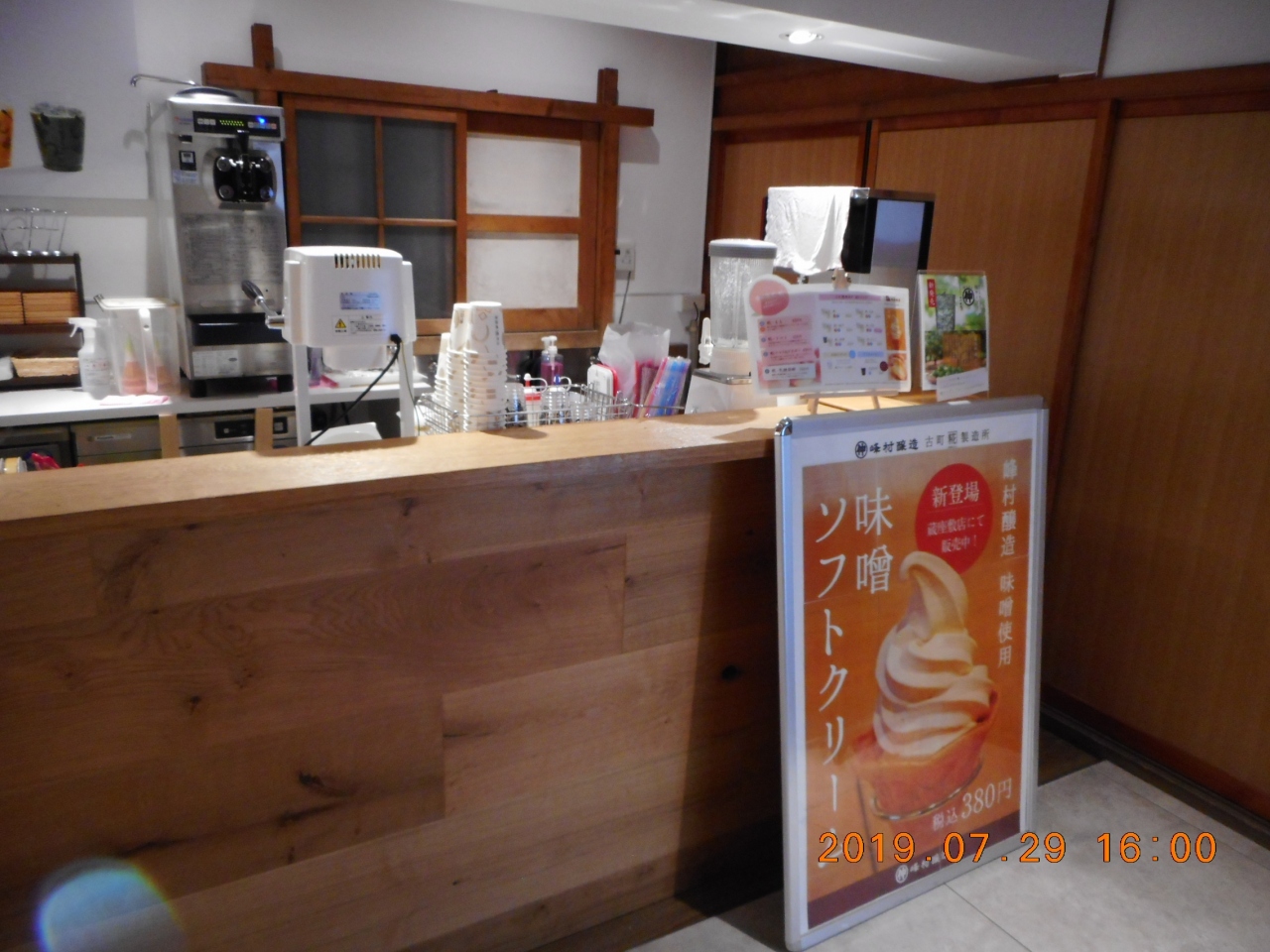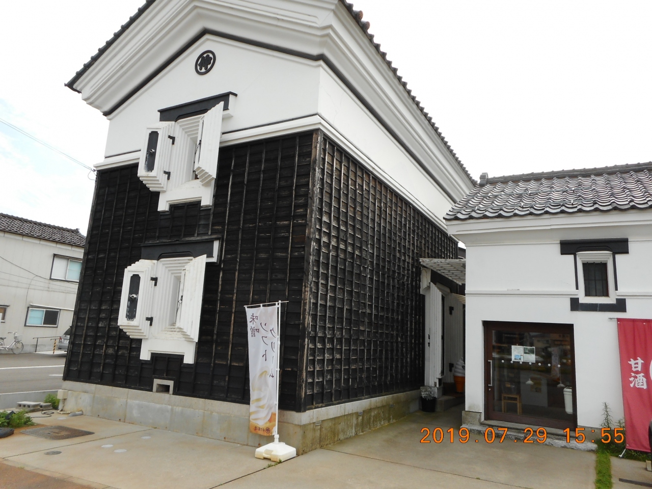 沼垂テラス商店街から南に向かって10分程で着いたのが峰村酒造さんです。道幅の広い粟ノ木バイパス沿いにあった麴製造所でした。趣のある2階建ての蔵とお味噌や麹製品を販売している建物が並んでました。お店で試飲をさせてもらって、お隣の蔵の中のカフェでソフトクリームと麹ドリンクをいただきました。