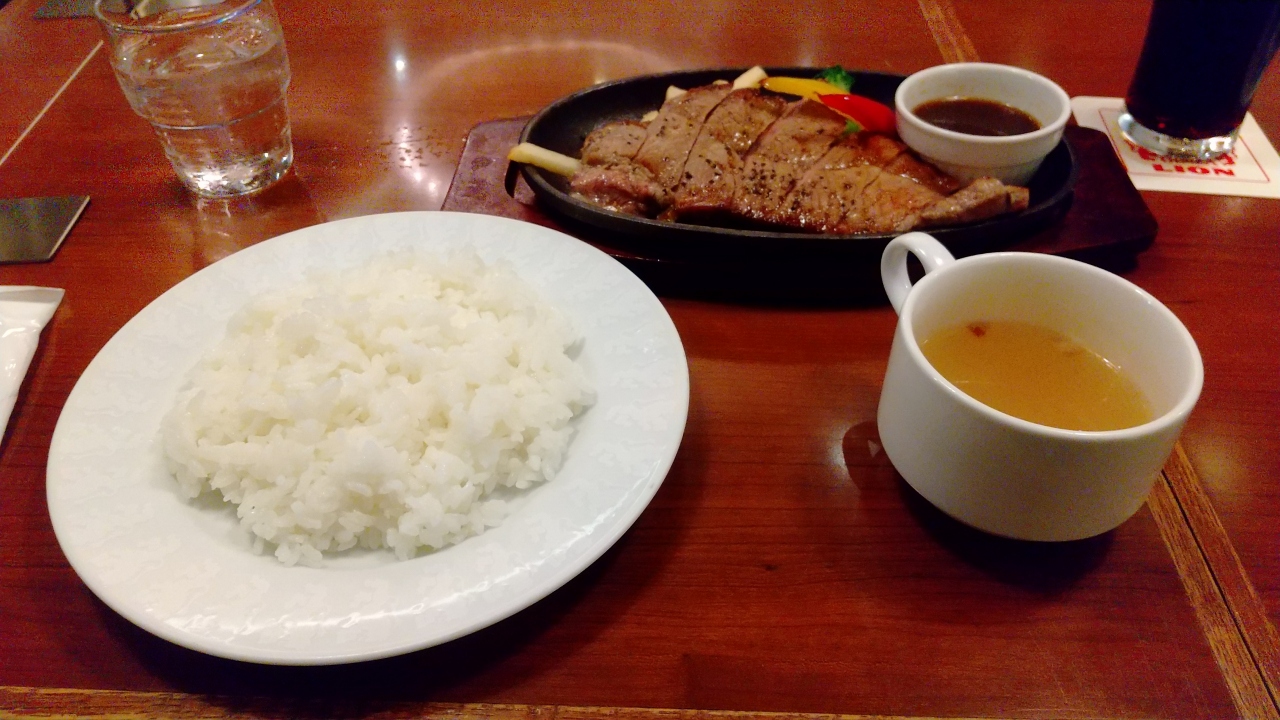 ランチにステーキ定食と黒ビールをいただきました。クリームトップの黒ビールを注文しようとしたけど品切れでした。ステーキは肉の量も多くてお腹いっぱいになりました。店内は天井が高めで地階だけど明るくてきれいな感じです。