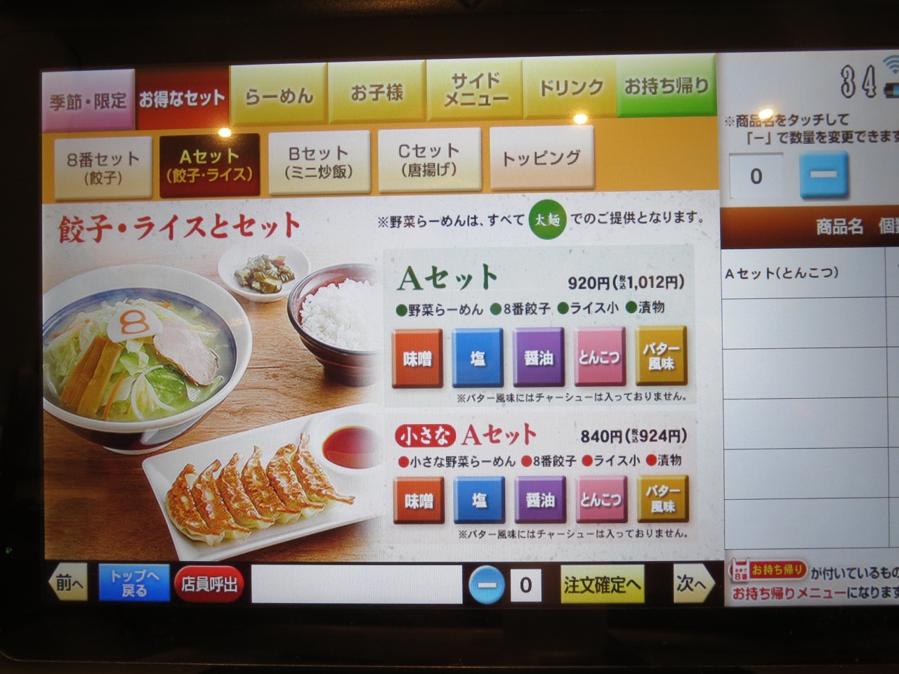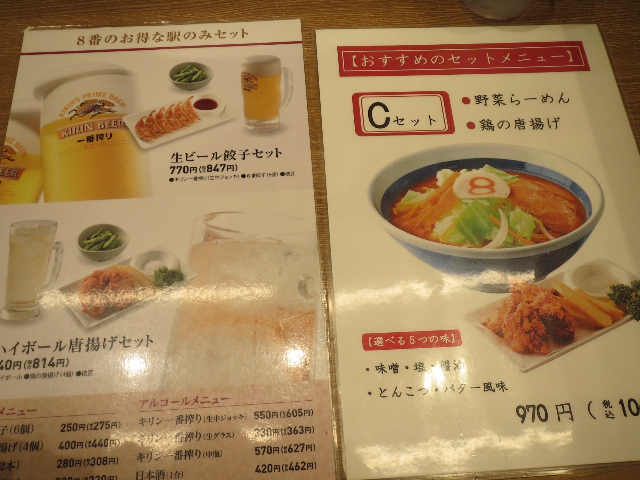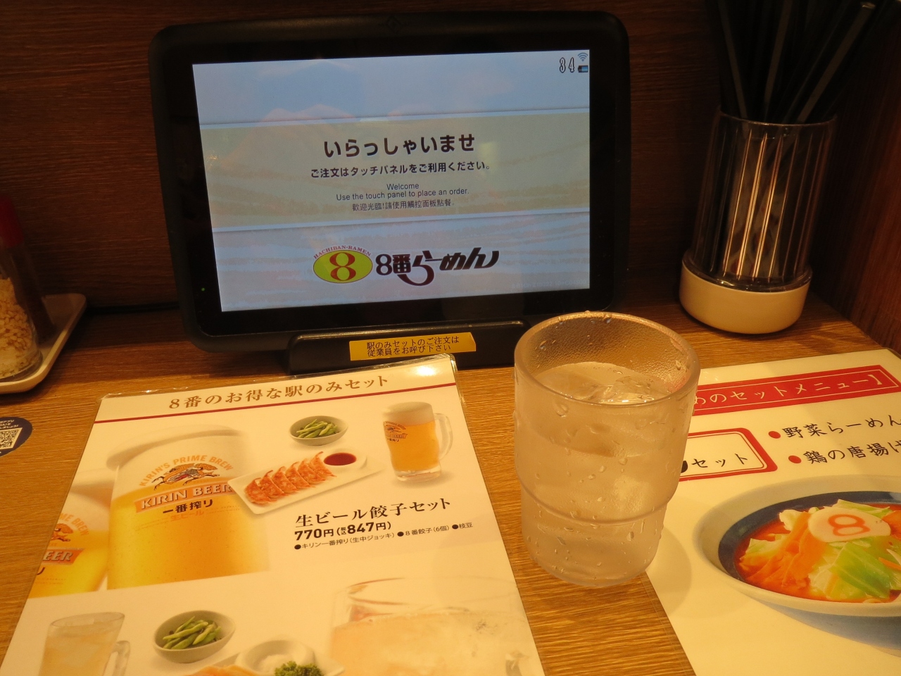 福井駅のPRISM FUKUI 一階奥にあるらーめん店。ランチ時の店内は混んでいるほう。名前を書いて5分待ちで店内へ。店員さんは挨拶がしっかりしている。とんこつラーメンと餃子・ご飯のAセットをオーダー。野菜たっぷりの長崎チャンポンのよう。8番のかまぼこが真ん中に。麺は中平麺、4センチ四方大のキャベツが大量に乗っかっている。とんこつスープが美味しい。餃子は冷凍餃子を焼いているようだが、焼きたてで味が良い。タッチパネルで冷凍餃子の調理法などを紹介。見ていても飽きがこない。この内容で税込1012円とはコスパが高いほうだ。