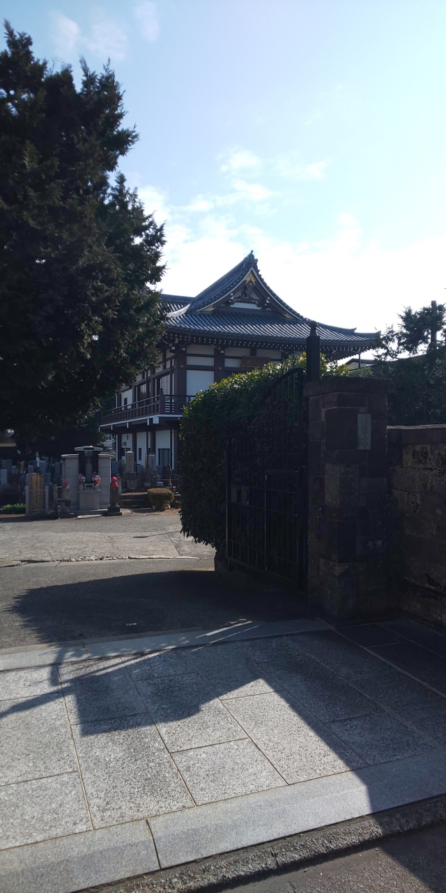増上寺下屋敷内子院はこの付近に点在しているのですが、なかでも本堂が大きく立派なのがこちらのお寺です。2階建てで見上げるような大きさで、さらに瓦屋根の勾配の曲線美がなんとも言えず美しく感じられます。