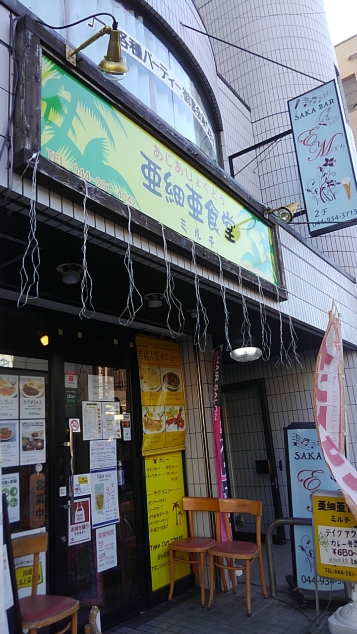 最寄り駅は小田急線の生田駅です。駅改札を出て左に行くと世田谷通りにぶつかるのですが、その並びにこちらの亜細亜食堂ミルチがあります。こちらではカレー(インドカレー)をいただきました。インド料理のほかにナシゴレンなどもありました。テイクアウトもやっています。