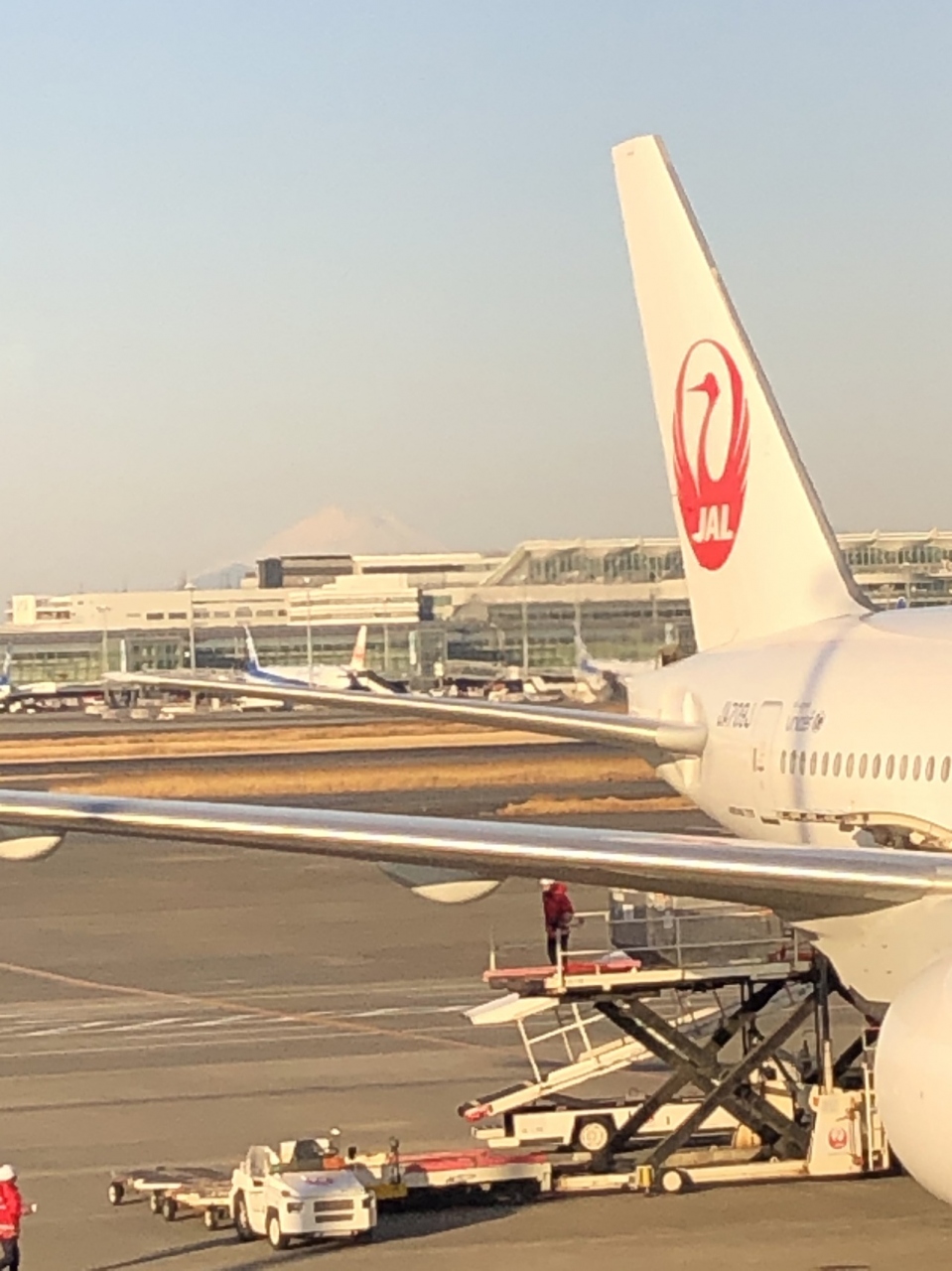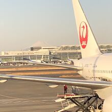 JALを利用しました。搭乗ゲート近くから飛行機をみたとき、久々に乗ることもあってワクワクしました。遠くには富士山を見ることもできて、天気に恵まれて絶景でした。