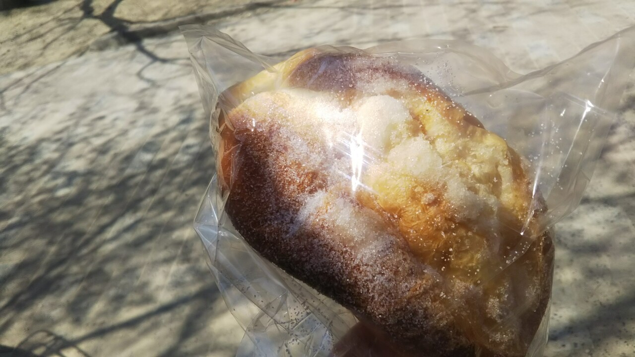 いろいろあったからなんにしようかなと迷って結局シンプルなパンの上にグラニュー糖がまぶされてるものにした。めちゃまぶされとった。可もなく不可もなくの普通の素朴な味わいかな。テイクアウトして公園探してそこで食べたわ。