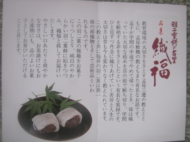一箱1200円と、ちょっと高級感があるお値段ですが、織物の織と福井の福から命名されたというこの商品は、見栄えも良くて、お土産物としても最適だと思います。