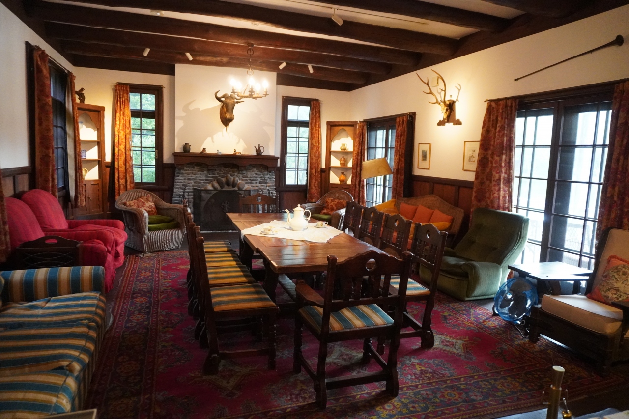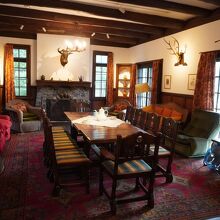 パークに入って、一番最初にその美しい姿が目に入って、すぐに訪ねました。設計はあのW・M・ヴォーリズ。軽井沢の別荘の歴史上で最も上質な建築物とも言われる木造建物で、レンガ色の地に白いアクセントのカラーが周囲の緑によく映えます。一階の暖炉のある広間は、かつてのサロンを彷彿とさせるシックな雰囲気。すべてがうっとりするような気持ちになる建物です。