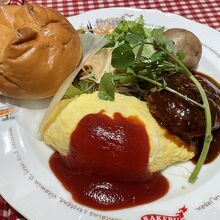オムライスのレストラン。府中駅ビルのル・シーニュの1階にあります。店員さんのコスチュームがちょっとレトロでかわいいです。オムライスとハンバーグののったセットをいただきました。小さめのじゃがいもが丸ごと、バターの染み込んだラケルパンも美味しいです。