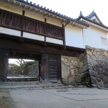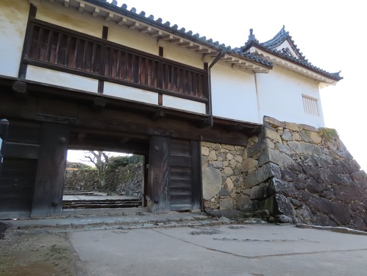 天守のある本丸表口を守る櫓門。いよいよこの先が国宝天守です。城内に合図を送る太鼓があったことから太鼓櫓と言われています。正面からは一般的な櫓門でしたが、くぐって振り返ると高欄付きの廊下が見えていて、なんだかユニークな構造になっていました。