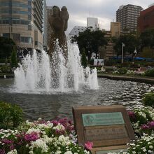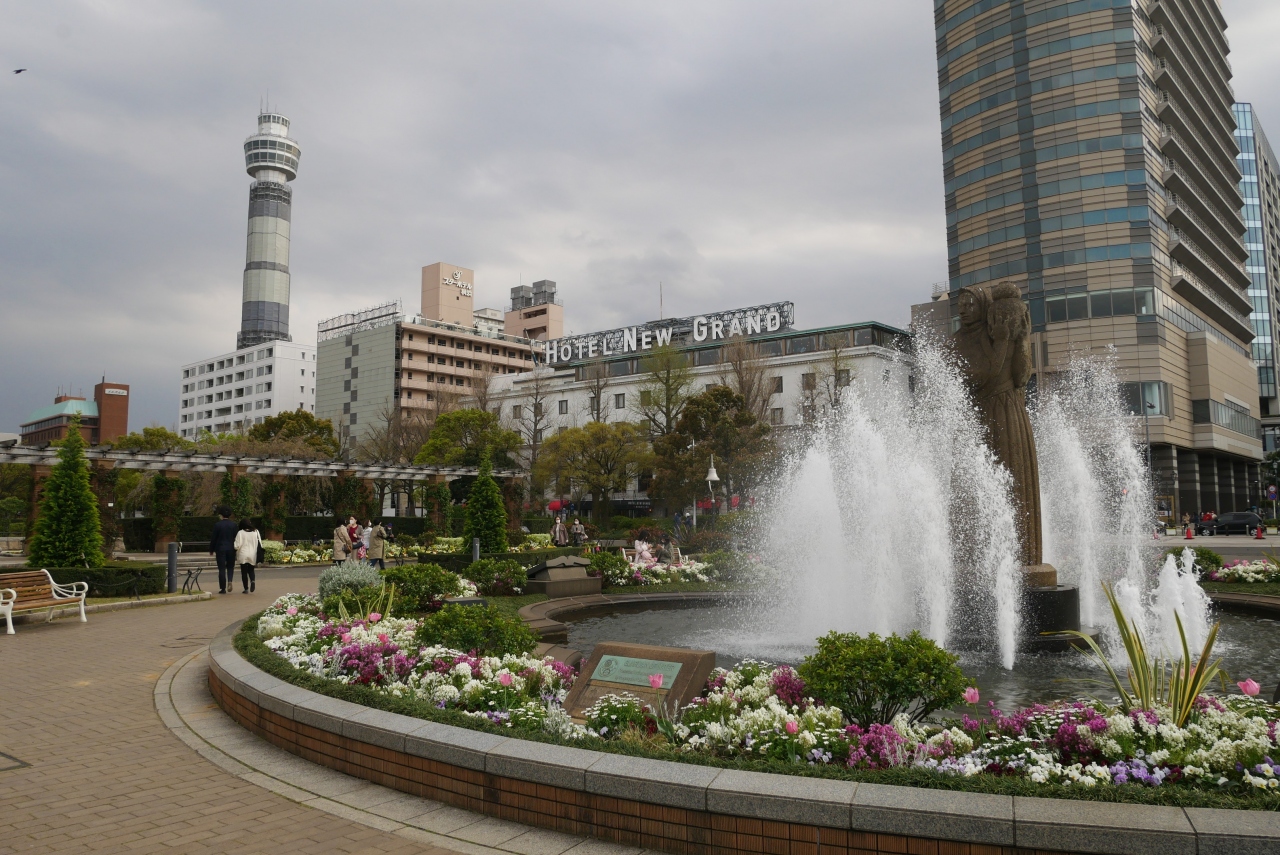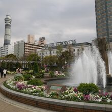中華街から真っ直ぐ山下公園に入った正面にあり噴水
