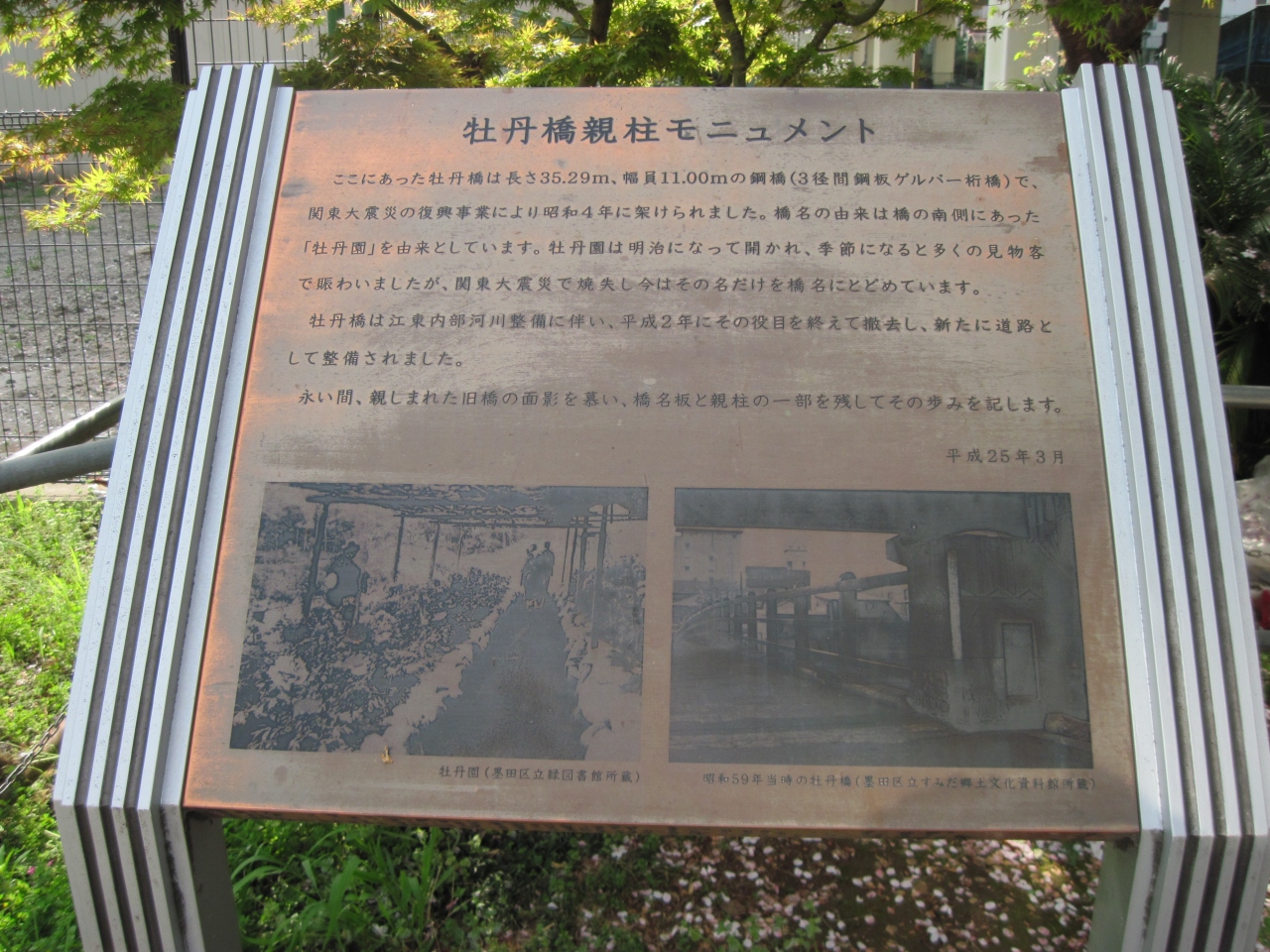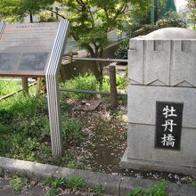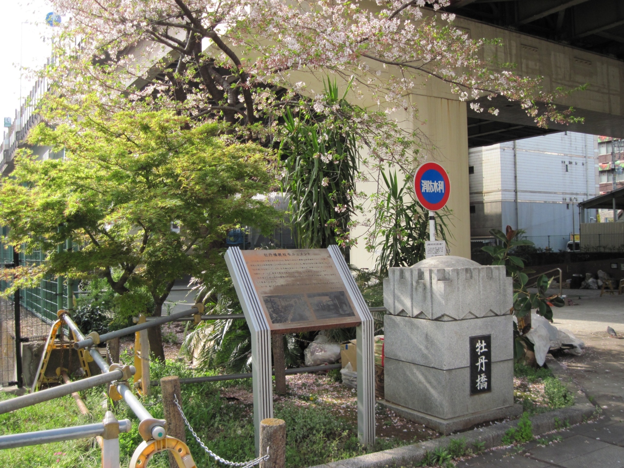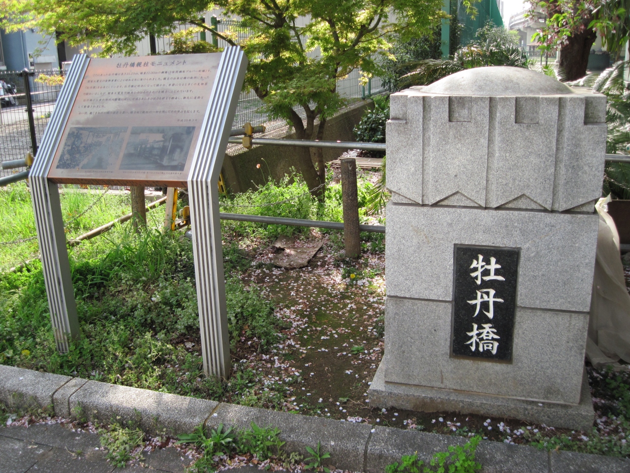 注意していなければ気が付かないほどの、橋の柱だけが残されている場所です。昔は周辺に牡丹園があってにぎやかだったそうですが、残念ながら今ではその面影は、橋の姿を含めて全く残されていないので、想像するしかありませんでした。