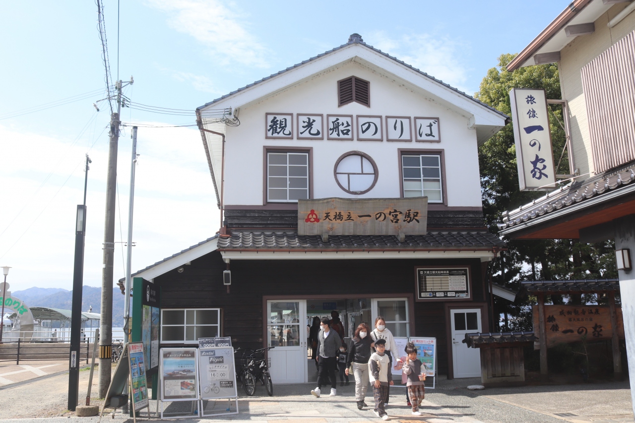 天橋立の北側の観光船発着場です。レトロ調の建物の船乗り場になっています。文殊堂からの観光船はこちらに到着し、股のぞきで有名な傘松公園ケーブルリフト乗り場や元伊勢籠神社への最寄りの観光拠点となっていました。