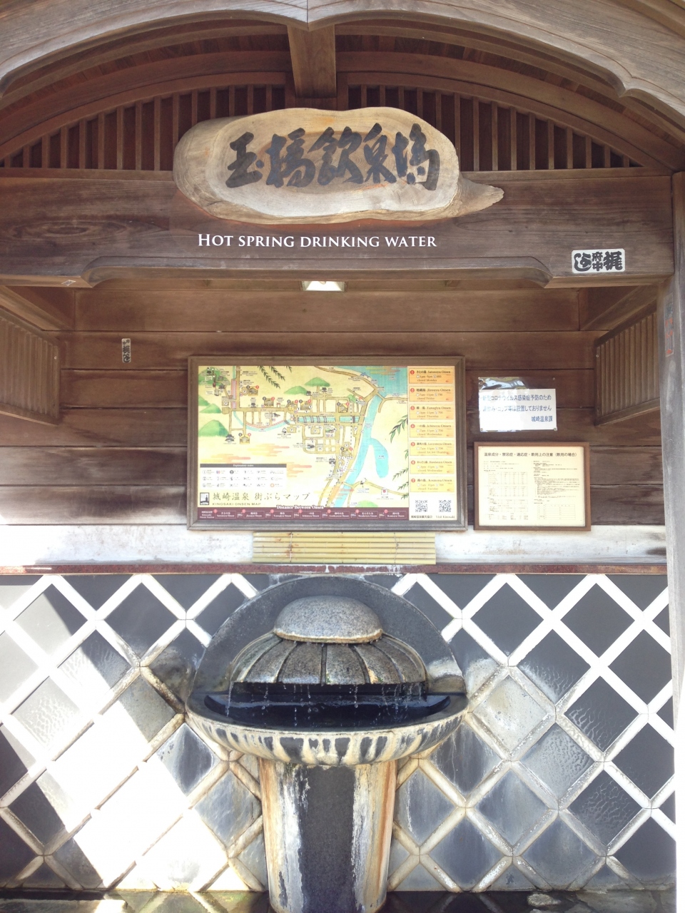 一の湯のすぐ側に、玉橋飲泉場がありました。新型コロナの影響でコップは撤去されていたので、手で触ると、お湯は生ぬるく少し舐めると塩分がを感じました。他に城崎温泉駅前と、ロープウェイ乗り場近くにも有りますよ。