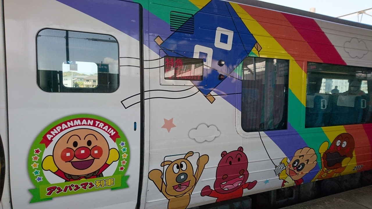 松山から八幡浜まで利用しました。松山駅での乗車は、改札入ってすぐの1番乗り場。偶然、アンパンマン列車にあたりました。車体一面と、車内の天井にアンパンマンのイラストが描かれ、車内のドア両サイドにアンパンマンの絵が張られていました。