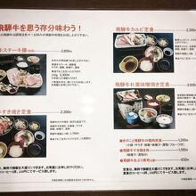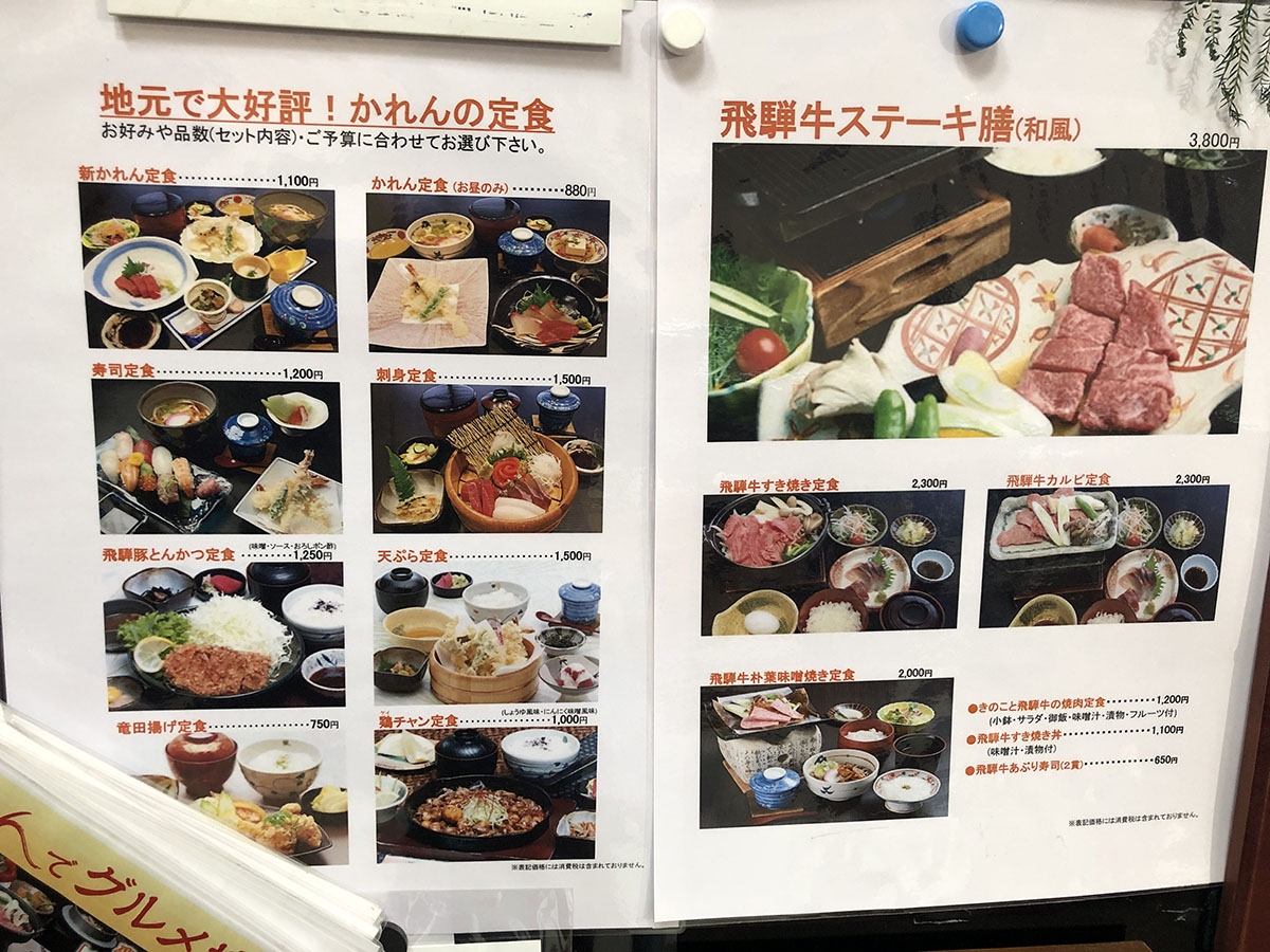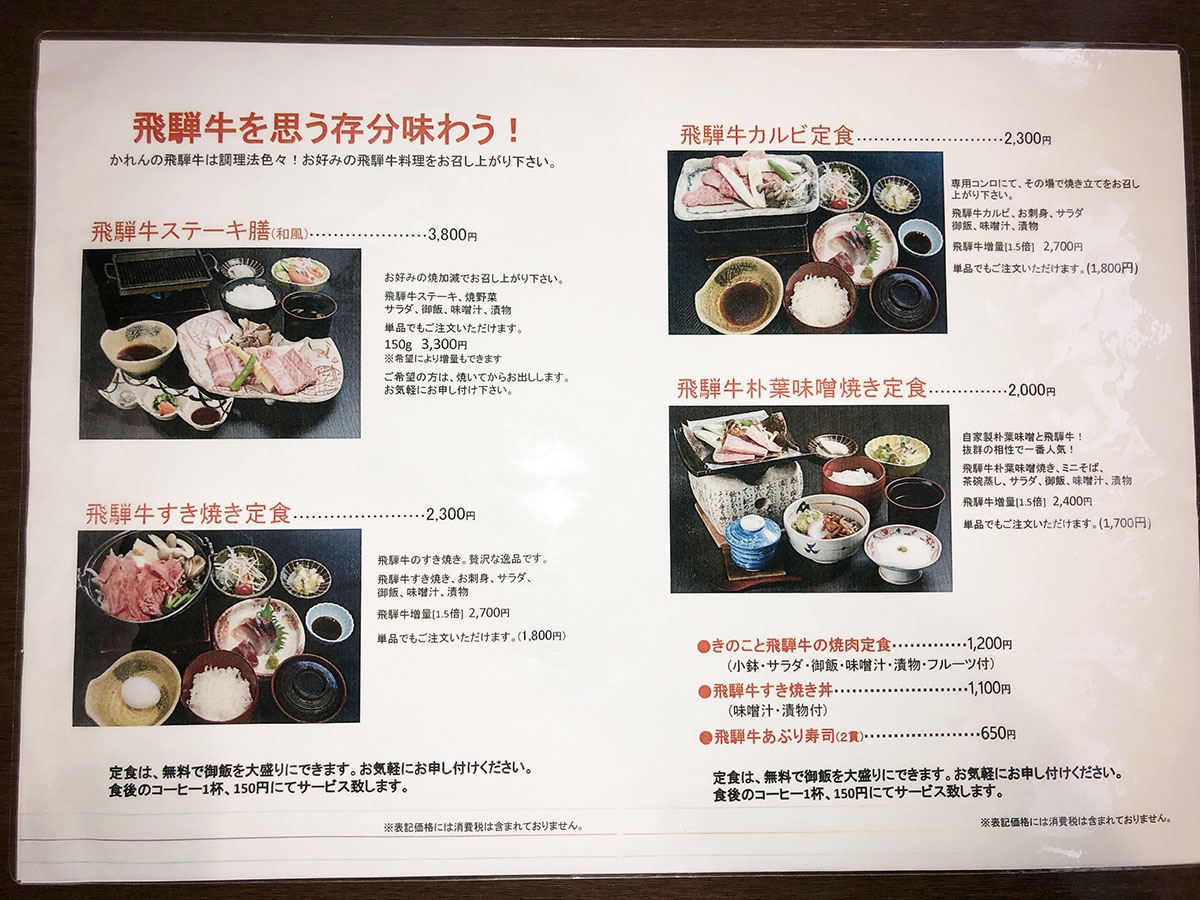 レストランでランチをいただきました。お手軽な丼物,麺類からセットメニューなど色々ありました。今回はシンプルなかれん定食を頂きました。飛騨牛のすき焼き定食,飛騨牛朴葉味噌焼き定食,飛騨牛ステーキ膳など,飛騨牛をお手頃価格で食べたい方にもオススメです。