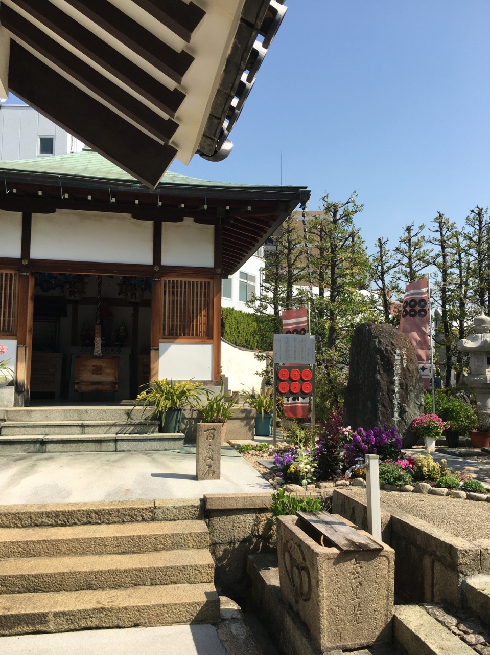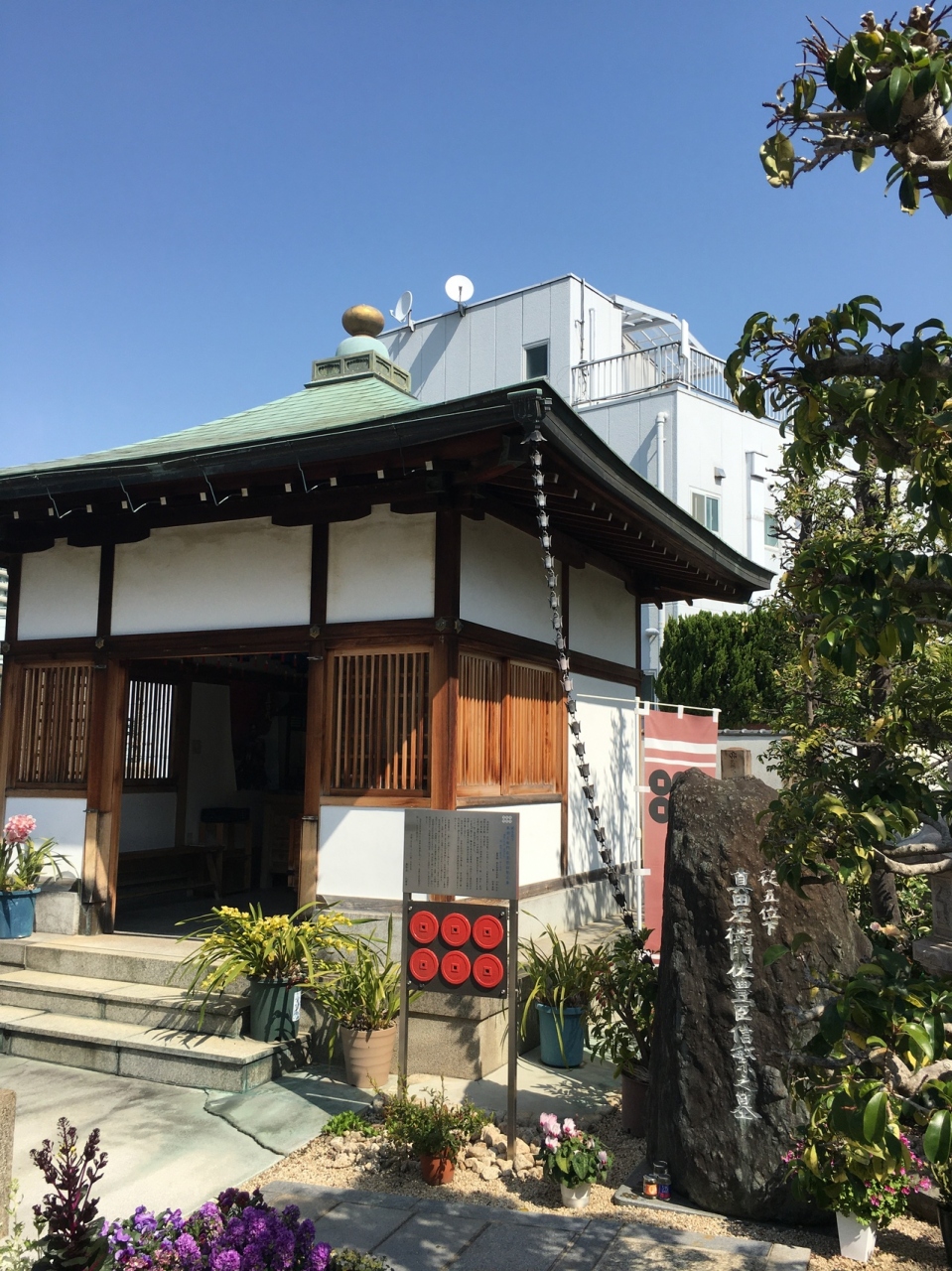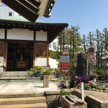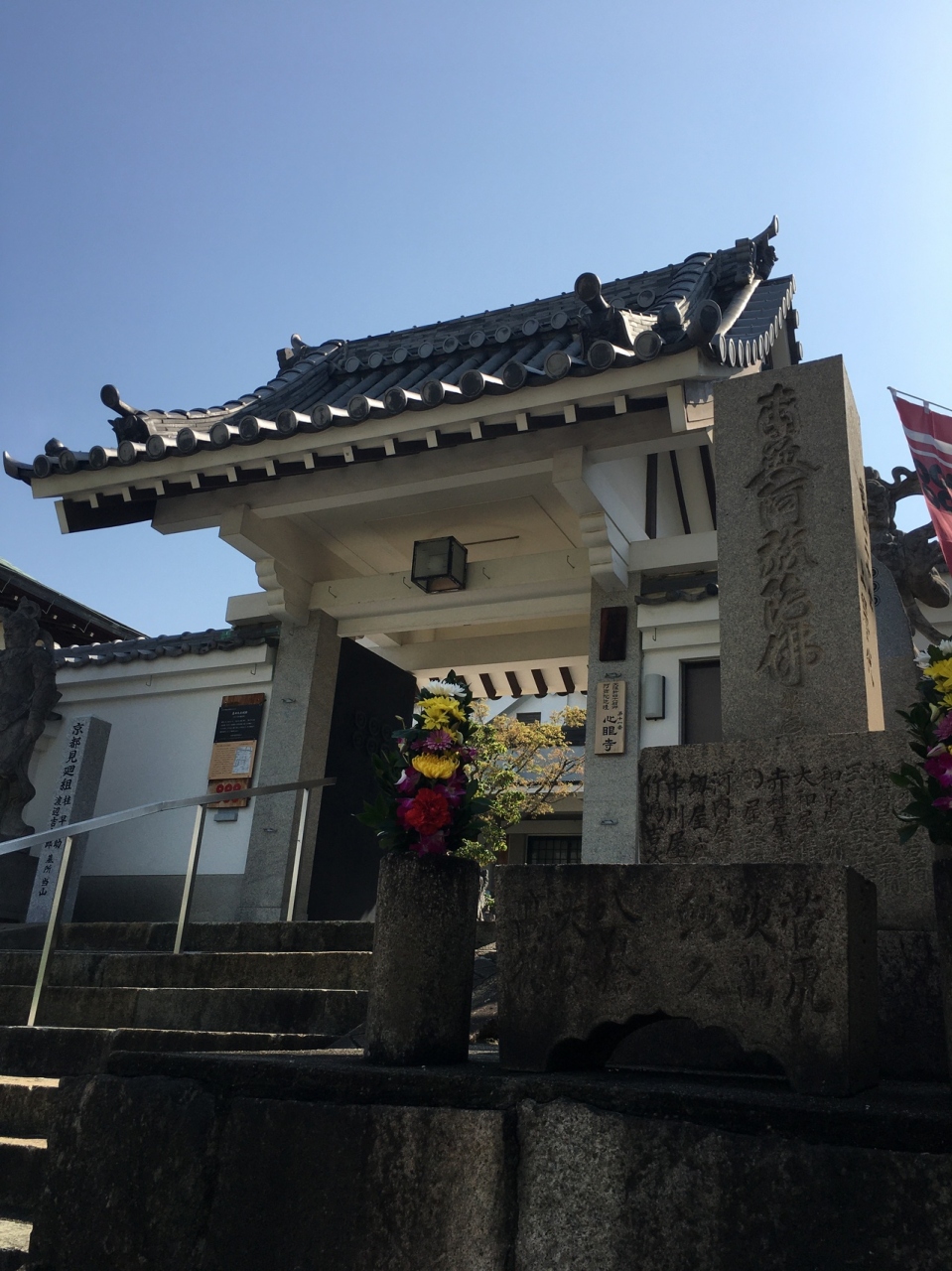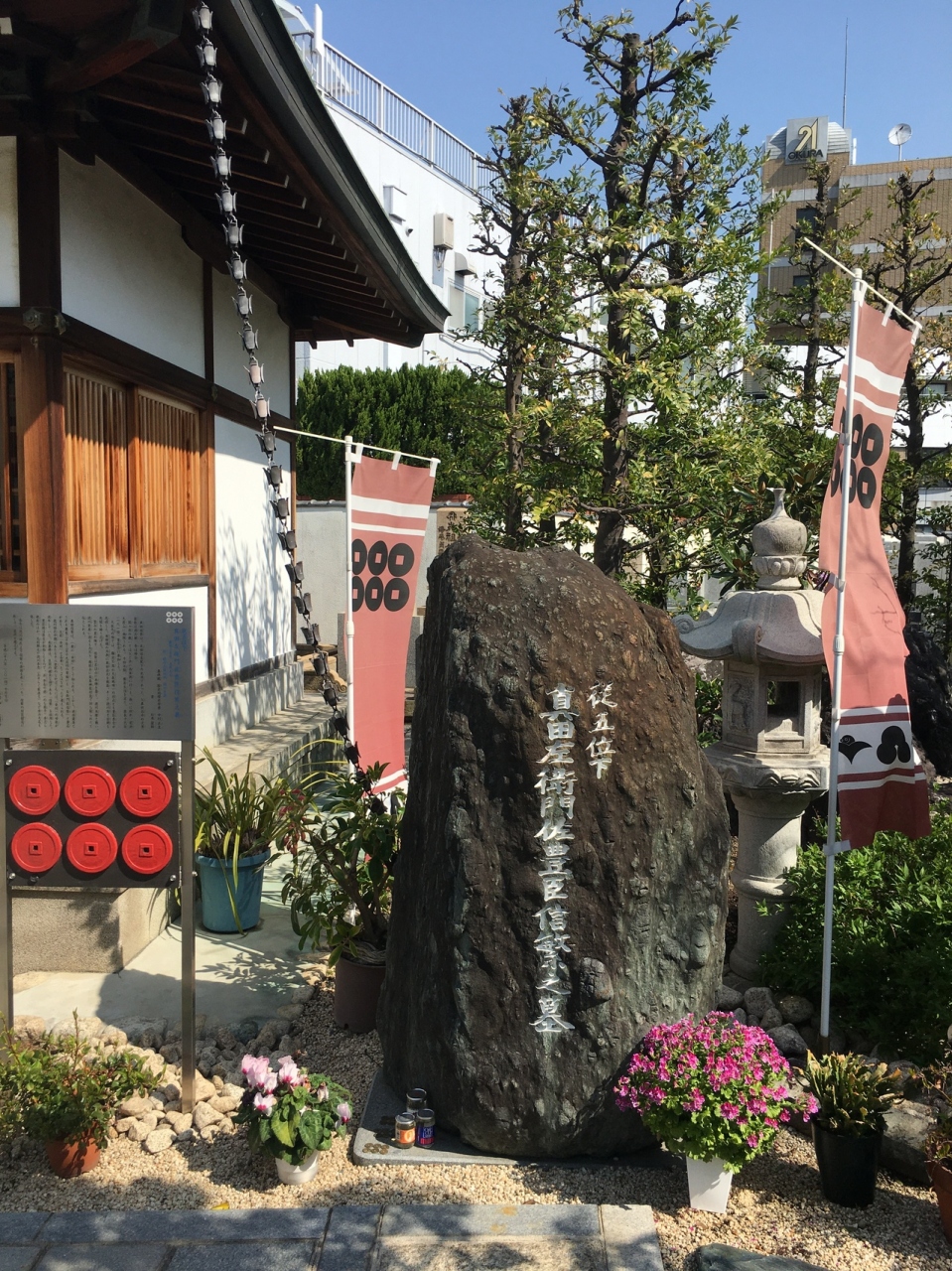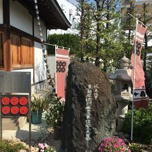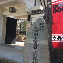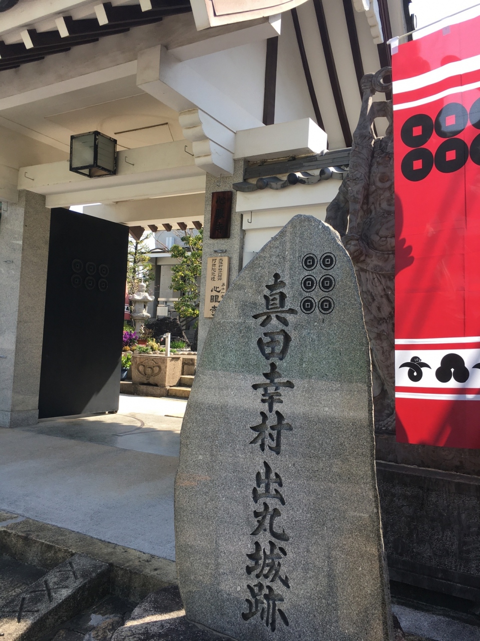 坂沿いにある綺麗にあるお寺で真田丸出城跡で、真田の六文銭の赤い旗が靡いていました。境内に入ると正面が本堂で奥にはお墓が広がっていました。真田幸村のお墓もあり、後方には溶岩のような岩がいくつかありました。