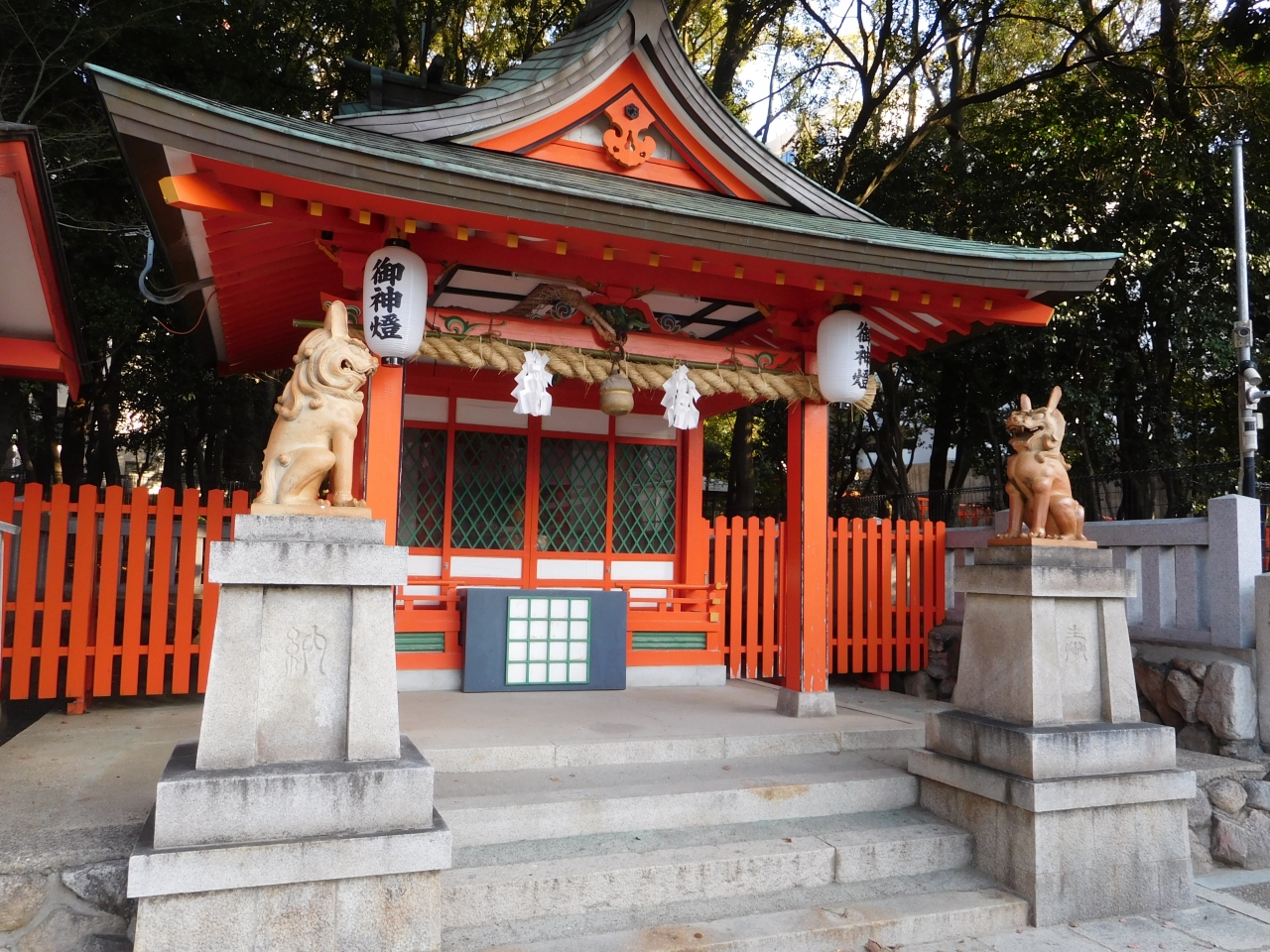 生田神社本殿の裏側、「生田の森」の手前側にある、「えべっさん」の名前で親しまれている商売の神様「蛭子命」を祀った「蛭子神社」です。神社の前には、鳥居ではなく、狛犬が設置されていて、とてもユニークなデザインの狛犬だったのが印象的でした。