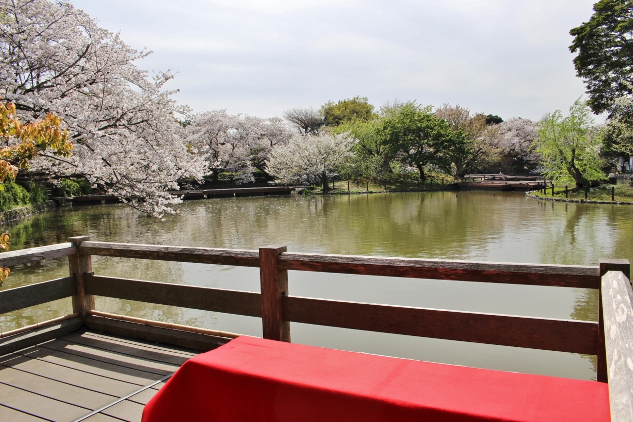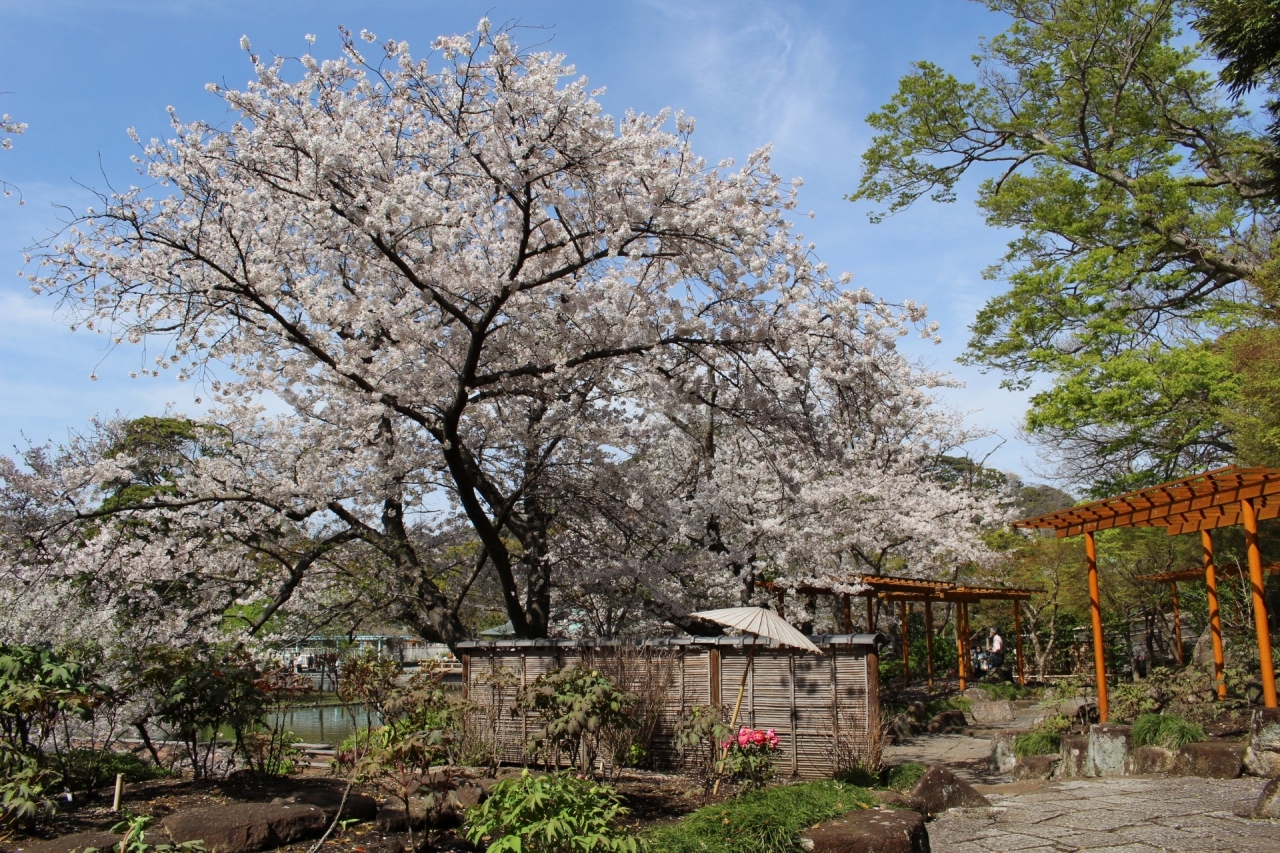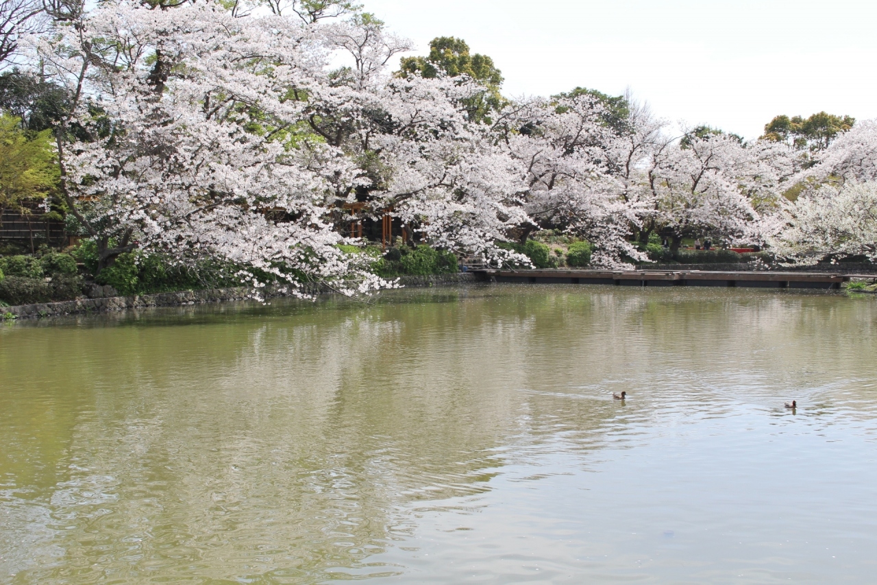 源氏池の南側と東側にはソメイヨシノの大木が並び、桜の開花時期は見事である。