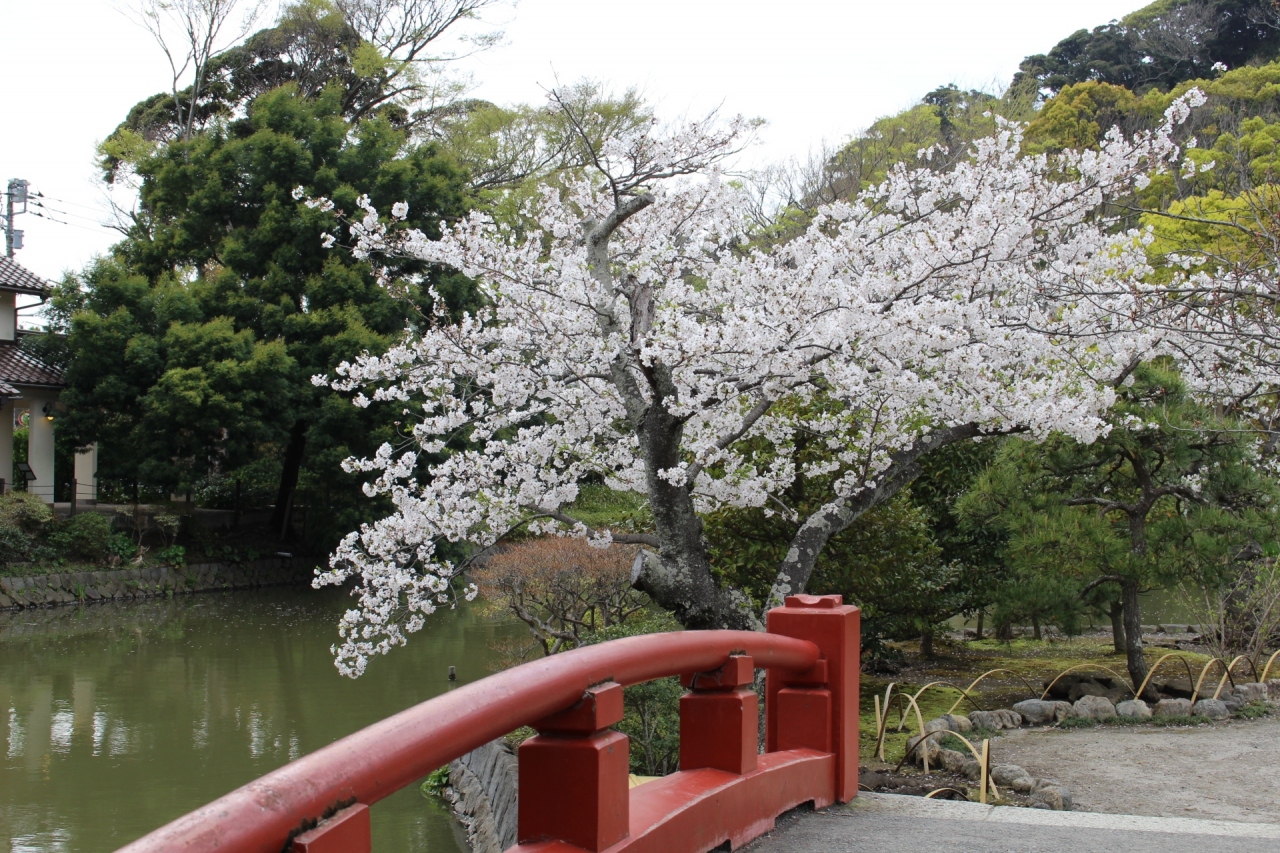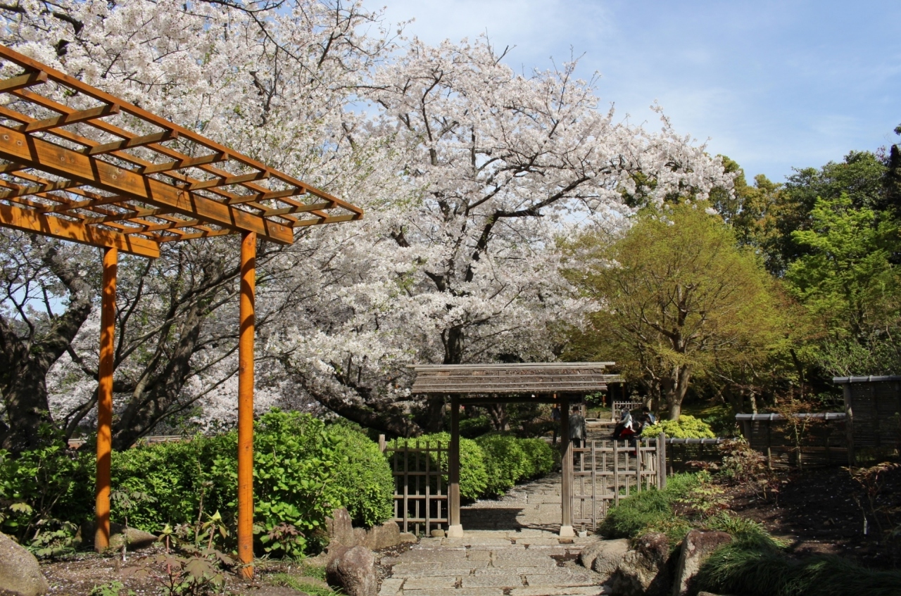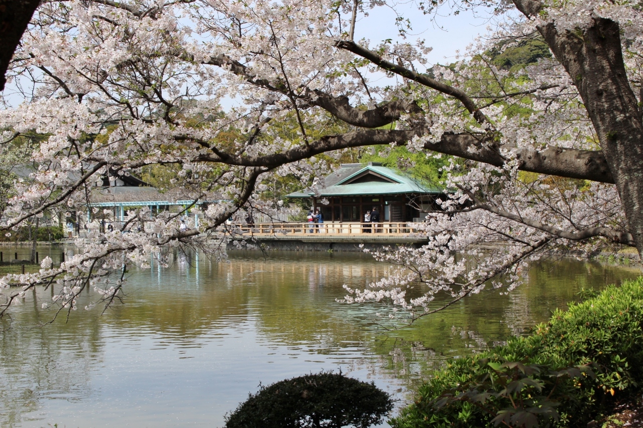 源氏池の南側と東側にはソメイヨシノの大木が並び、桜の開花時期は見事である。