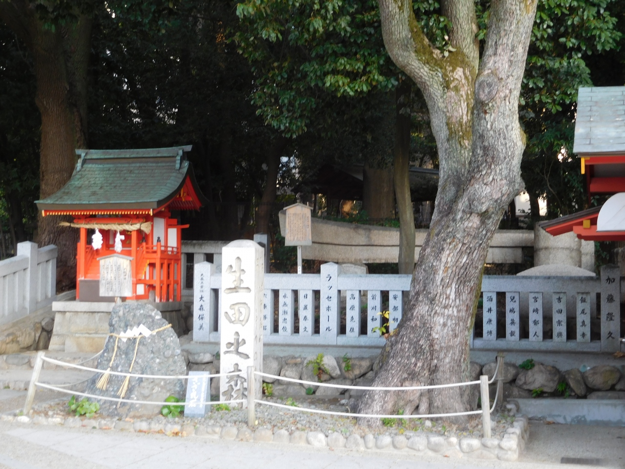生田神社本殿の裏側、「源平合戦の古戦場」ともなった歴史のある「生田の森」に「折れ鳥居と礎石」が置かれています。この「生田の森」の開門時間は、午前10時から午後4時までで、朝早い時間は中に入る事が出来ませんでしたが、ちょうど「さざれ石」の裏側に、折れ鳥居があり、少し奥側になってしまいますが、説明板もこちら側に向けてあったので、読む事が出来ました。少しだけでも見る事が出来て良かったです。
