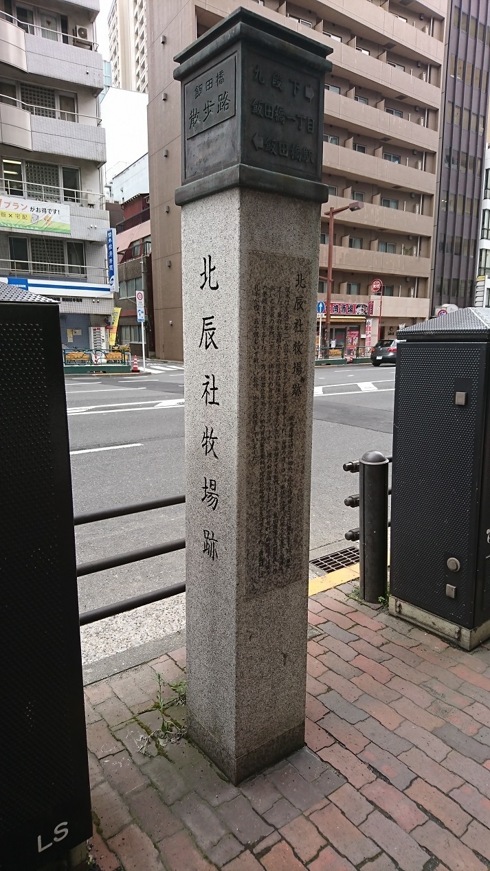 飯田橋駅と九段下駅を結ぶ目白通り沿いにある歴史標柱の一つです。明治時代初期、幕臣だった榎本武揚が開いた北辰社牧場のあった場所です。明治時代にこの場所に牧場が有ったなんて驚きです。目白通り沿いには同じデザインの標柱がたくさんありますので、一通り巡ってみるのも楽しいものです。