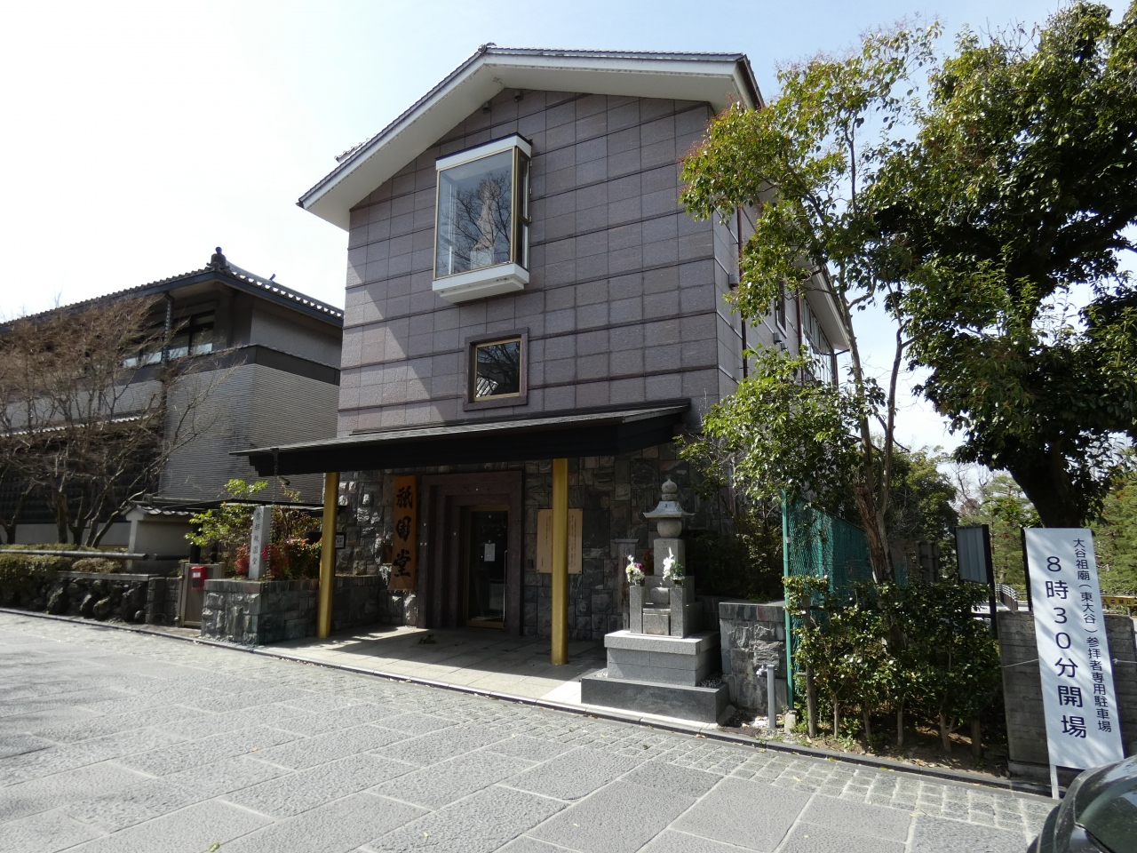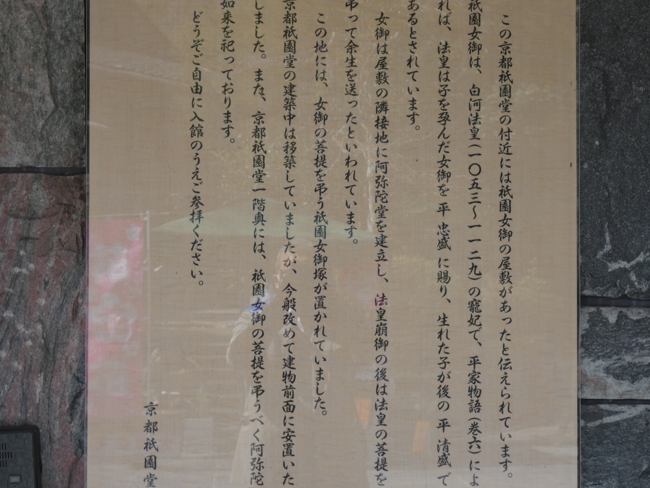 円山公園の南側で長楽館の南のビル。かつてこの付近に白河法皇の寵愛を受けた祇園女御の屋敷があった所だそうです。法皇崩御の後、隣接する阿弥陀堂で菩提を弔って余生を過ごしたそうです。祇園女御と言えば八坂神社境内の忠盛燈籠が関係しています。懐妊中の女御を忠盛に下賜して、生まれたのが平清盛と言われています。ビルの前に建つ供養塔は見逃しそうです。