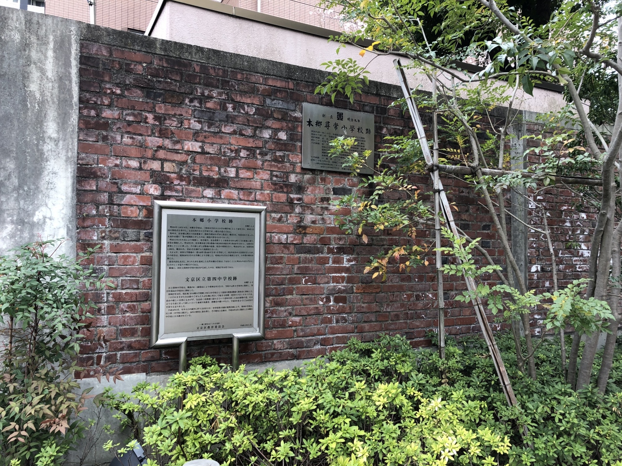 昭和20年の空襲で校舎などは焼失してしまい、現在はレンガ塀だけが残っており、そのレンガ塀に本郷尋常小学校跡という金属プレートが取り付けられており、塀の前の植え込みには説明板も設置されています。地域の歴史を伝える大切なモニュメントですね。