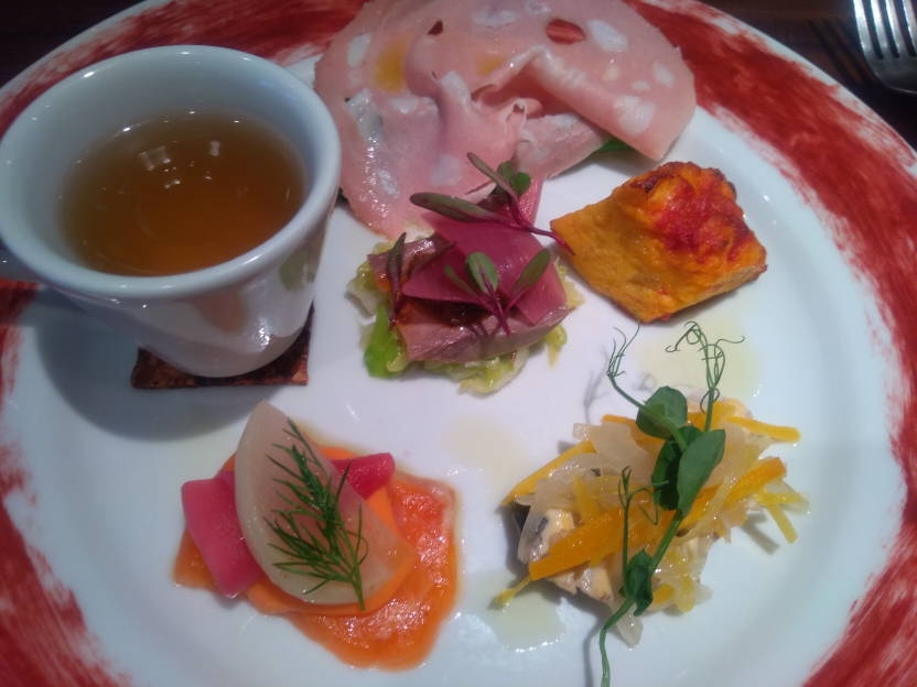 「トラットリアビコローレヨコハマ」でランチをいただきました。前菜とパスタで2000円(税抜)のランチに白のグラスワインをつけました。白のグラスワインは一番手頃にもので900円でしたが、2000円のランチにはもう少し手ごろなワインがあると嬉しかったです。さっそく前菜の5種盛りと一緒にワインを楽しみました。そして、1皿目のパスタは+300円の「シャラティエッリ サルディーニャ産カラスミ 九条ネギ レモンのペペロンチーノ」でした。レモンの爽やかさが心地よかったですが、九条ネギの香りでカラスミの香りが消えてしまったのはちょっと残念でした。2皿目は「スパゲティ リコッタチーズ入り 生ハムとサラミのラグー トマトソース」でした。こちらも美味しかったですが、ちょっとボリュームが足りなかったです。最後にカプチーノで締めましたが、二人で6710円で男性だとちょっと食べたりないボリュームだったので使い方が難しいと思いました。