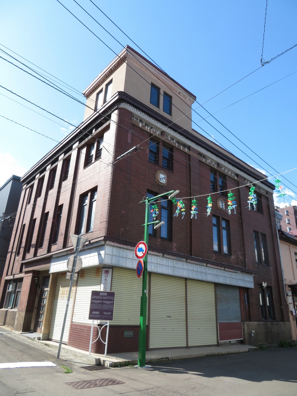 昭和5年築の小樽市指定の歴史的建築物です。建物の外壁は、褐色のタイルで覆われていて、2階の窓の上に、酒樽の看板が掲げられています。昭和初期のモダンさが感じられる洒落た外観です。ただ、近所の方のお話によると、もうお商売はやっておられないということです。寂しいですね。