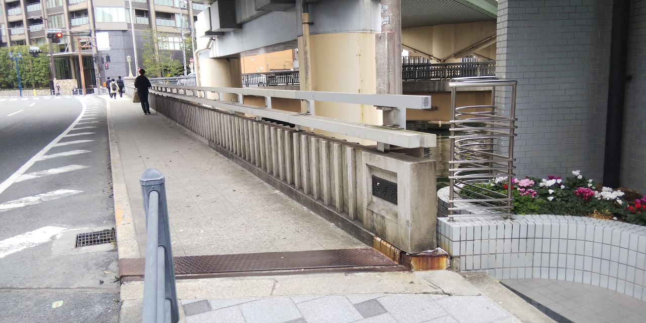 葭屋橋は大阪の東横堀川にかかっている橋です。東横堀川にかかっている橋では一番北に位置する橋で、今橋のすぐそばにありました。車道は片側二車線ぐらいあるなかなか広い橋ですが、歩道はちょっと狭いかなと思います。