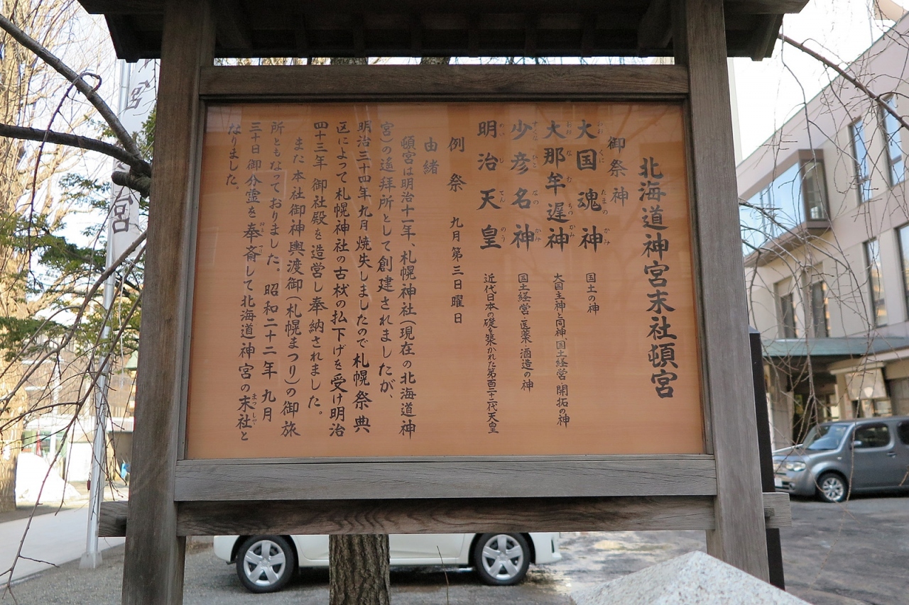 「千歳鶴酒ミュージアム」を訪れた帰り、目の前に見えていた「さっぽろテレビ塔」までちょっとした散歩の途中に見かけたのが、こちら「北海道神宮頓宮」でした。由緒には「札幌神社(現北海道神宮)の遥拝所」とありました。「北海道神宮」って「円山公園」に隣接している場所なのに、遥拝所って…。それだけかつての冬の北海道は閉ざされた場所であったのでしょうねぇ。そんな一文に開拓時代の苦労を偲ぶことができました。