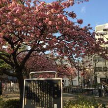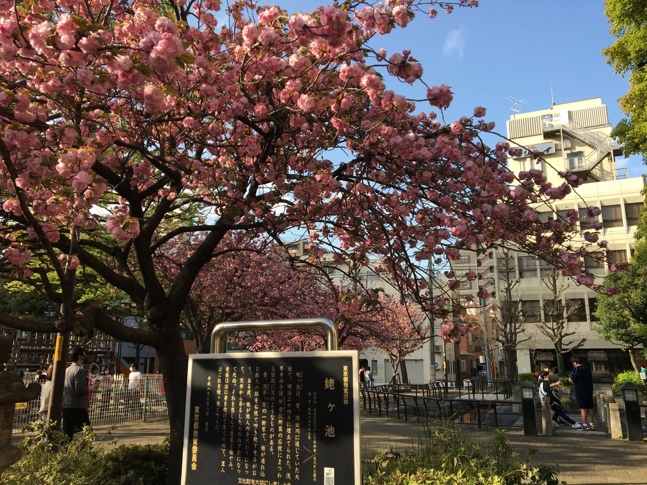 公園の北側の一角には綺麗に整備された池があり、それが姥ケ池とのことで、碑と案内看板があり、歴史が説明されていました。ちょうど訪れたときは八重桜が満開の時期で、観光客も多かったです。