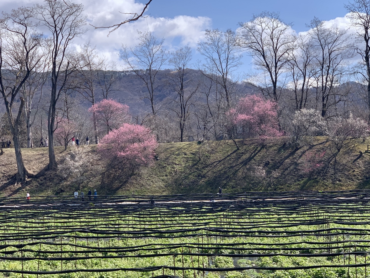 広大なわさび農場、梅の花が咲き誇り、素晴らしい景色でした
