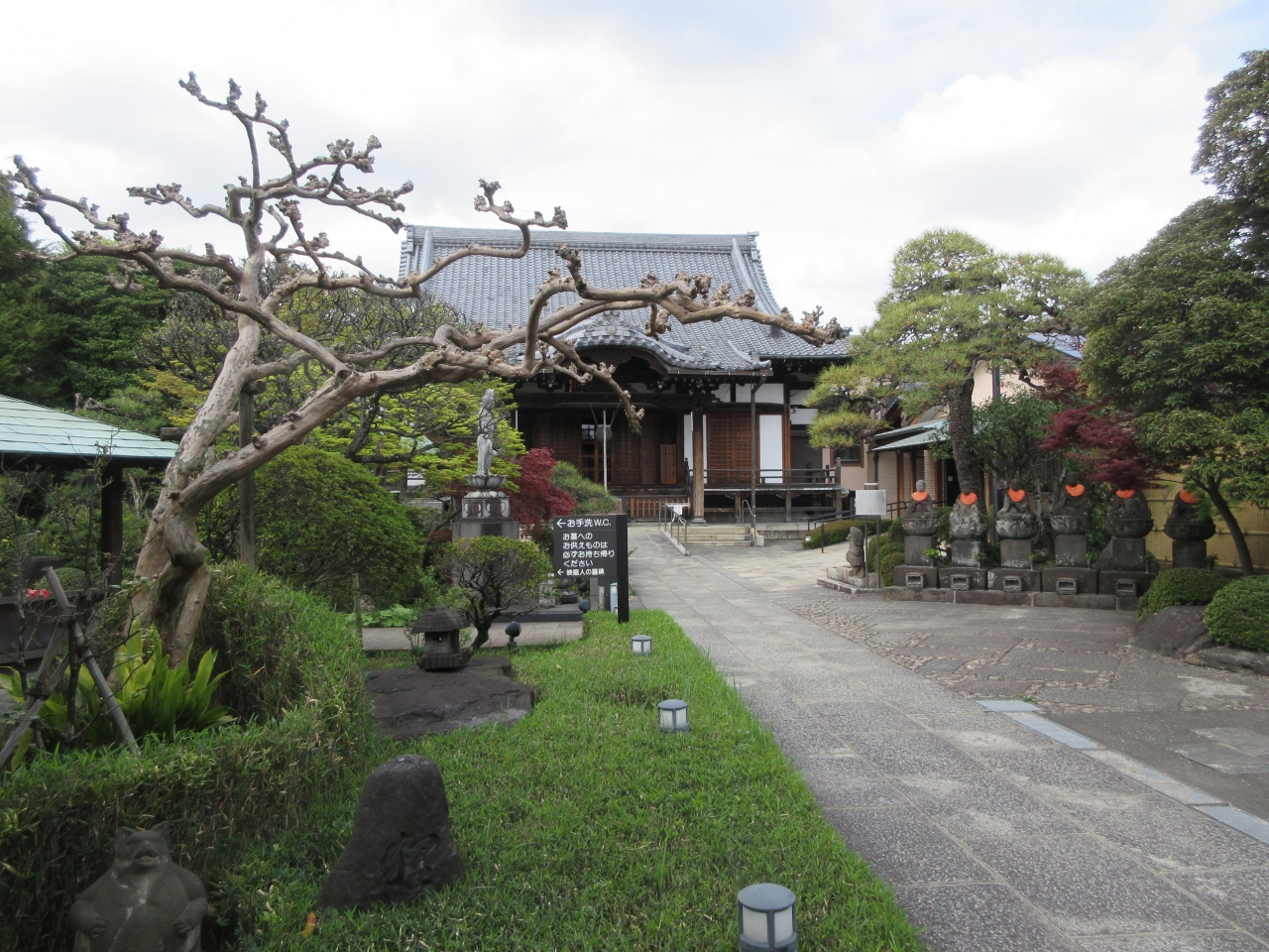 東武伊勢崎線・堀切駅から8分ほど、隅田川七福神の一つ・毘沙門天が祀られる真言宗の寺院です。閑静な住宅地に建っていて、緑豊かな境内の木々から新しい葉が咲き始め、心地よい小鳥の鳴き声が聞こえ、落ち着きが感じられる寺です。江戸時代中頃に再建された茅葺屋根の山門は趣があります。境内には、寺に住みついた狸を供養するために建てた狸塚や、東京大空襲で直撃弾を受けてねじれ曲がった鉄骨や、空襲で焼かれた木が今も展示、残っていて平和について考えさせられました。