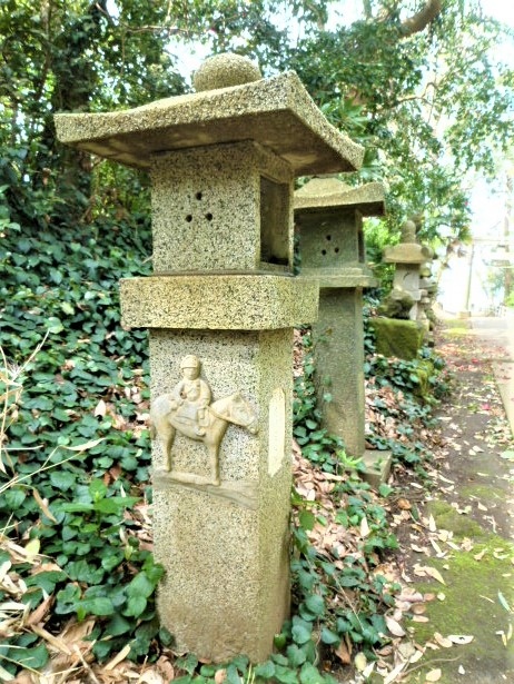 一の鳥居から眺める相模湾、`火の見櫓`も;時代物映画/TVでは見たことも,,(^^!) 境内を進むとうっそうした森の中に灯篭が数多くありましたが、今まで灯篭は`家紋/幾何学図形`が大半でしたが、`騎馬に乗った鎧武者`が(+_+);三浦一族の鎧武者(?)
