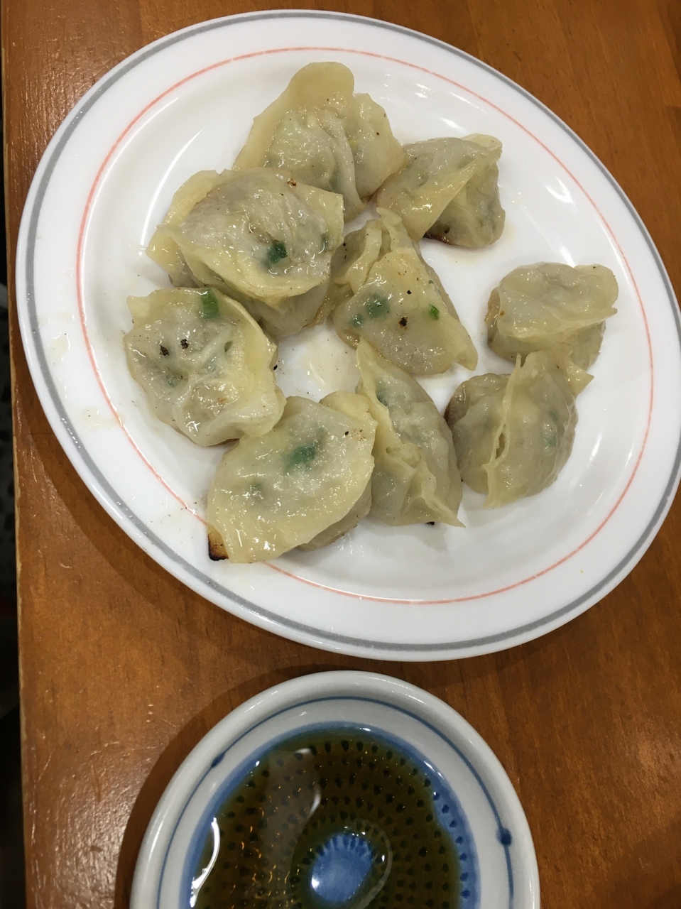 ホテルから思案橋の駐車場に車を停めたものの迷って、可愛い交番で道案内をお願いしました。ニラ卵も美味しく、酢の物はクラゲきゅうりとご飯をチョイス。お酒を飲まなかったのですが、外国の子とマスターが餃子を包んでました。