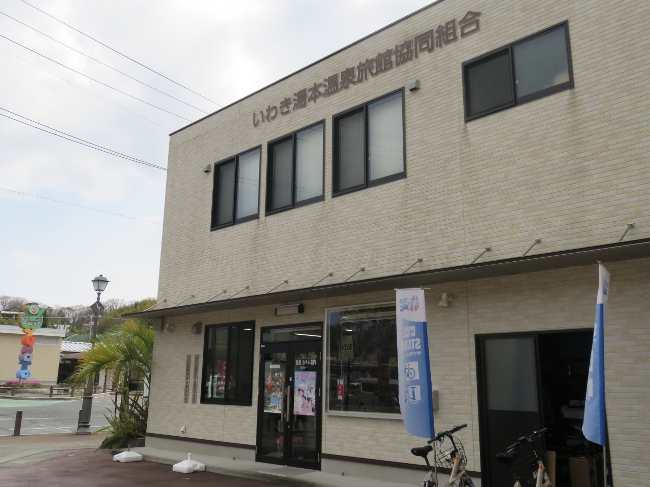 旅行に行くと観光案内所で情報を仕入れるのが常ですが、いわき湯本温泉では駅前に旅館の協同組合の建物があり、そこで観光案内もやっていました。建物の大きな掲示がいわき湯本温泉旅館協同組合となっていますが案内もしてくれます。