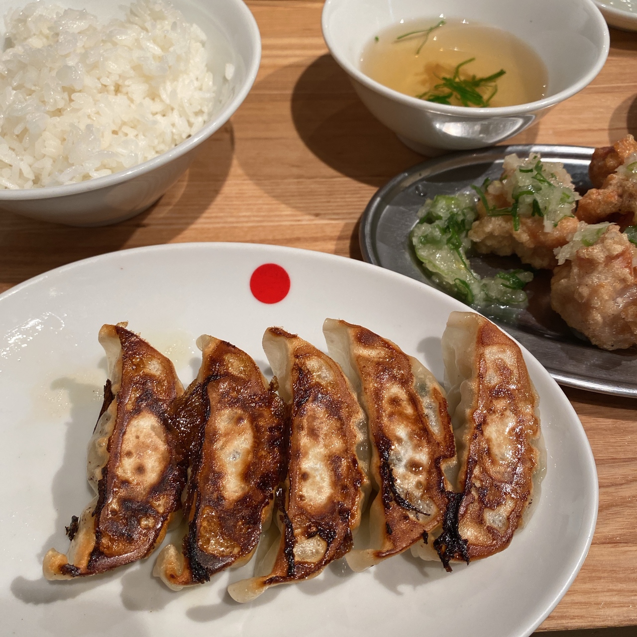 ランチにて利用しました。餃子6個と唐揚げ3個のセットしました。皮は薄めで、肉汁もほどよい餃子でした。ご飯スープ、もやしのナムルがついてきます。店内はカウンター席とテーブル席があり、きれいでした。食券です。