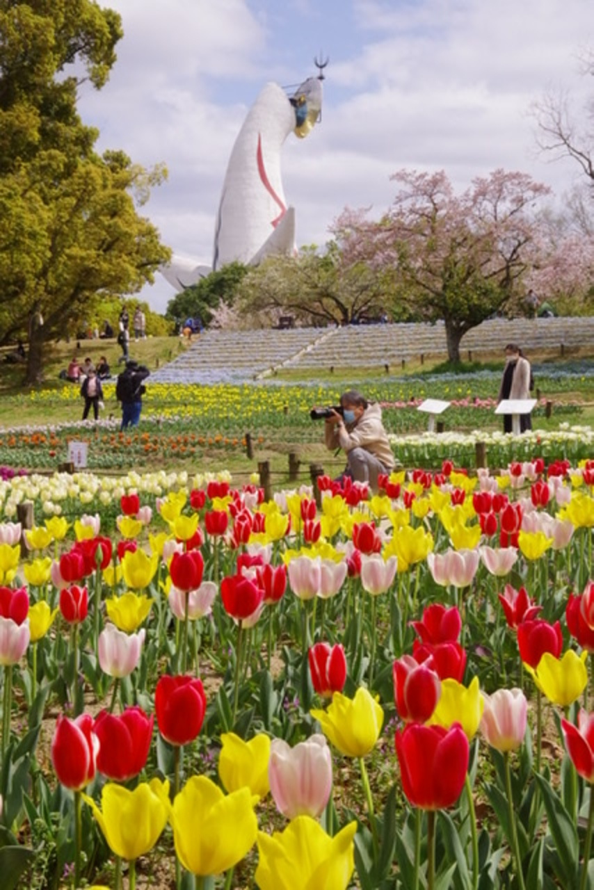 吹田にある大きな自然公園です。 1970年の大阪万博の会場跡が現在は自然豊かな公園になっていて、季節頃に公園内の色々なエリアで様々なお花を楽しむ事が出来ます。 場所によっては、太陽の塔とその花々を一緒に写真に撮る、SNS映えも狙えます。