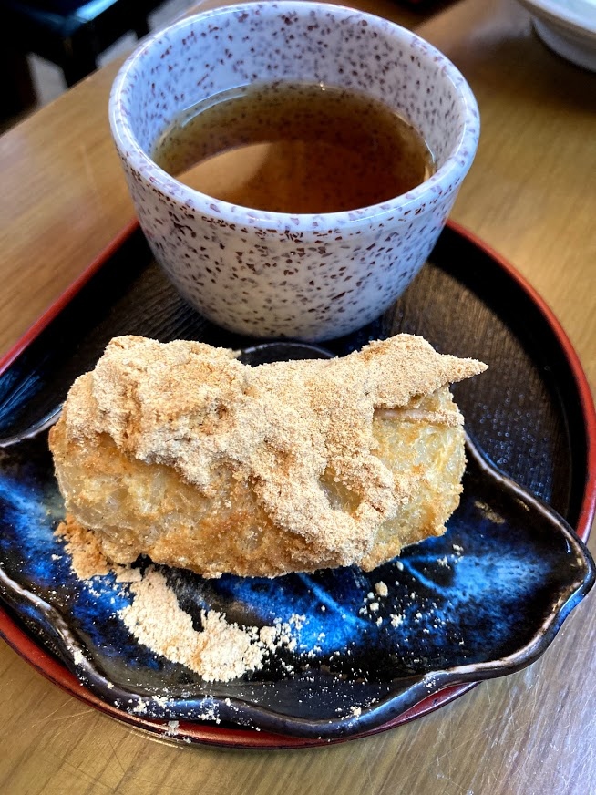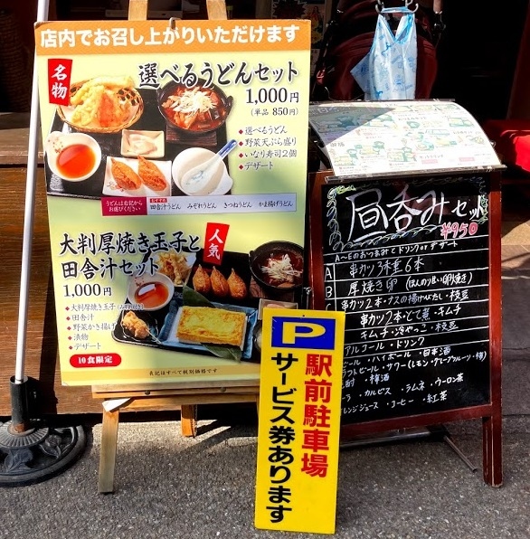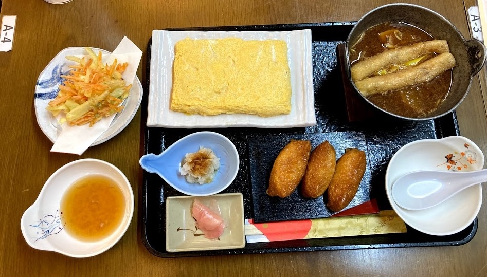 田舎汁は根菜がたっぷりいただけて、大判の厚焼き玉子、野菜のかき揚げ、稲荷ずし3コ、デザートにいなり揚げおはぎ(きなこ)まで付いて1,000円でした。