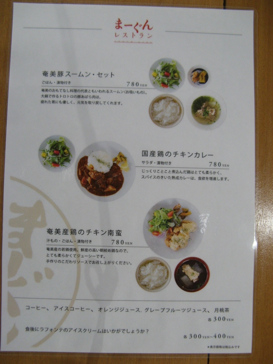 笠利町の里集落、県道602号線沿いにあるレストラン。お店の入り口には“まーぐん広場”と書かれた大きな暖簾がかかっていて一見レストランらしくないですが、店内は広く、天井も高く明るく、物品を販売するコーナーもあります。ランチに“奄美産鶏のチキン南蛮 780円”を頂きましたが、柔らかくジューシーでとても美味しかったです。料理メニューもドリンクメニューも数種類と少ないお店ですが、この地にあってはちょっとおしゃれで安いしいいお店でした。