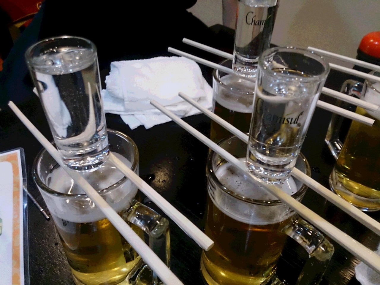 札幌市の大通の西14丁目のビルの地下にある韓国料理店です。焼き肉や鍋料理がおいしい店ですが、食べるほどに飲むほどの盛り上がって最後は、お店のスタッフに教えられたビールジョッキーの上に割りばしを置き、その上に焼酎の入ったグラスを置きます。これを頭突きで割りばしを割って、焼酎とビールが混ざったビーチュウをいただくという体育会系飲み物をいただきました。かなり盛り上がります。行った際にお試しください。