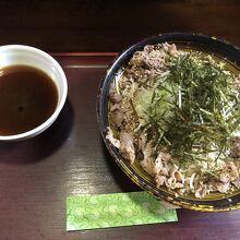 本格的な二八そばで、艶のあり、適度なコシがあって340円で食べられる、もりそばのクオリティではないレベルの高さ。そこらの蕎麦専門店よりも上かも。たくさん盛られたお肉は、牛肉で、少しパサパサしていますが、ラー油入りのピリ辛の甘さの汁につけるとまぁまぁイケる。ゴマとネギがたくそんのっていて、蕎麦と汁の相性も悪くない。