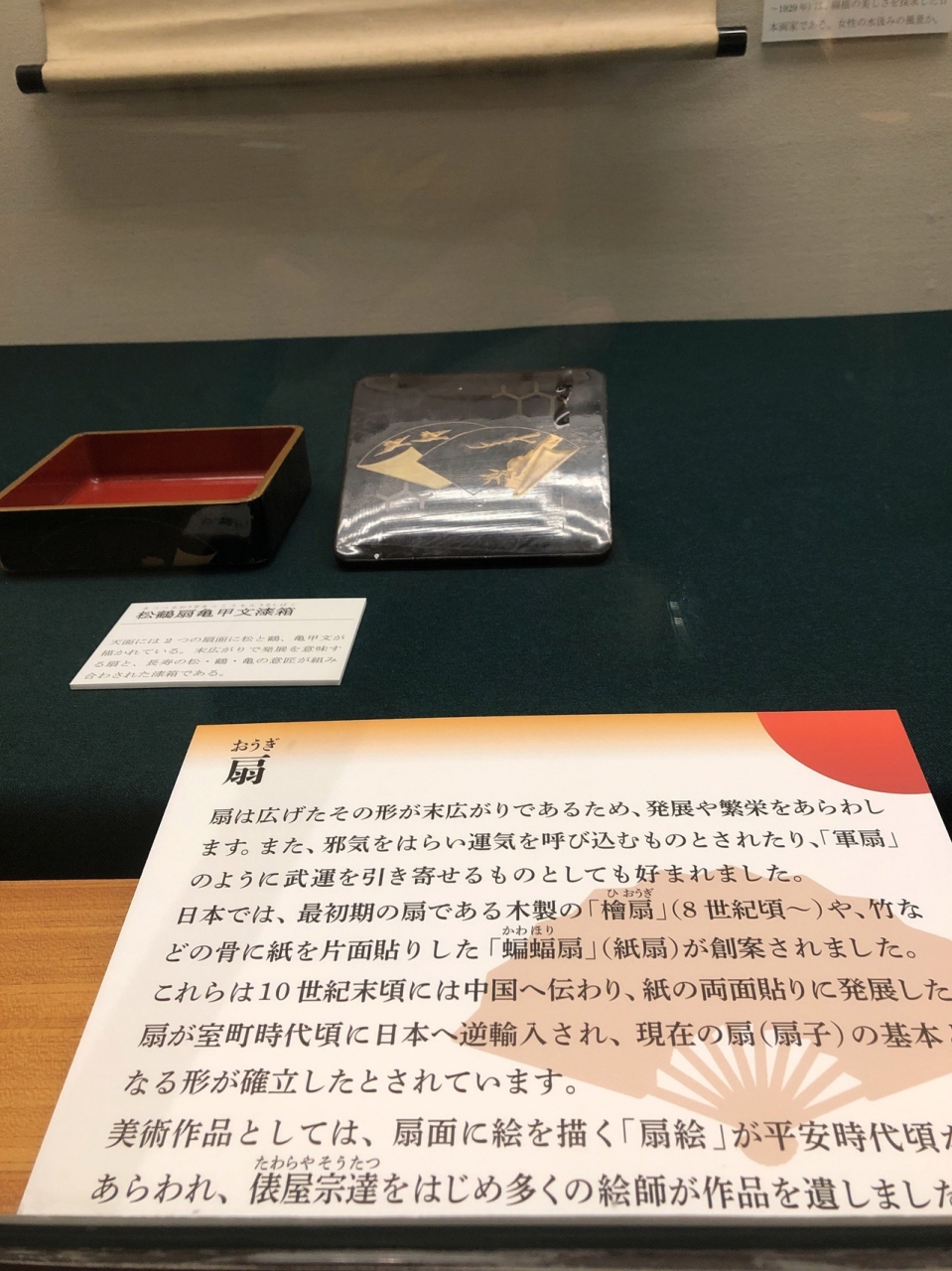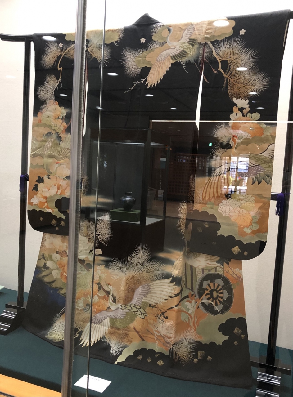 一番ときめいた展示品に「松鶴花模様振袖」があり、黒字に雲鶴・松・牡丹・菊・御所車が描かれた黒振袖がありました。