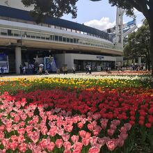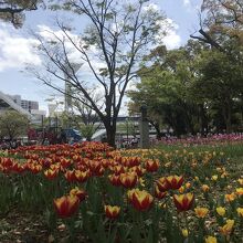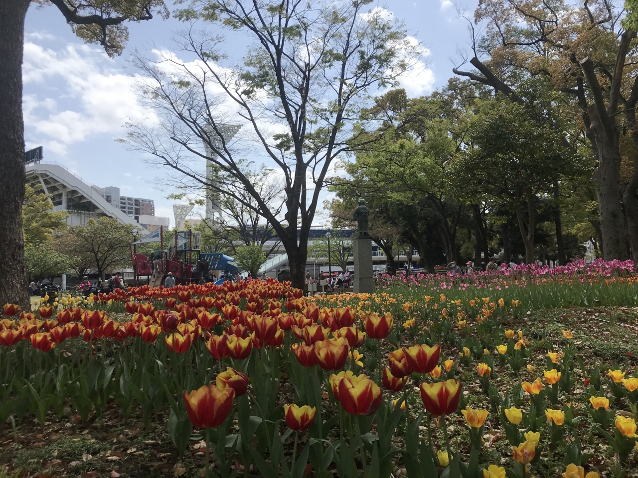 チューリップで有名な横浜公園、以前からチューリップの季節に来たいと思っており、今回、念願叶って、満開のチューリップを見ることができました。横浜スタジアムの前に一面のチューリップ畑が広がっています。見たことがないような色合いのチューリップもあり、いろいろな種類のチューリップを楽しめるお勧めスポットです。