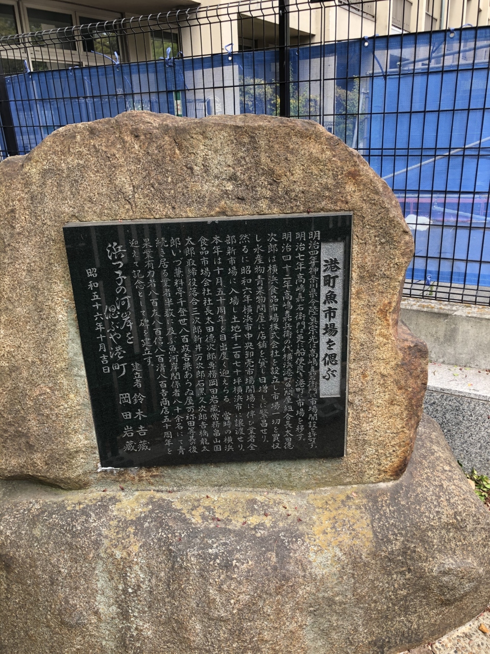 JR関内駅のすぐ前に、「港町魚市場跡」の碑がありました。後ろには「旧横浜市庁舎」があります。市場跡の碑の横には、市場の歴史について刻まれた碑もあり、それによると昭和6年に移転するまで、この場所に魚市場があったそうです。