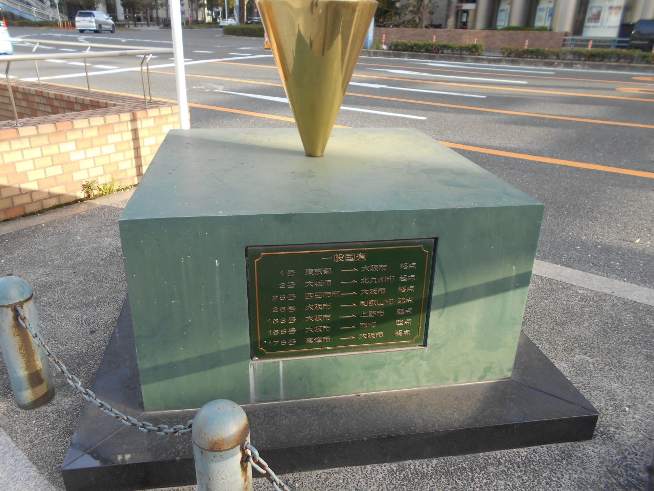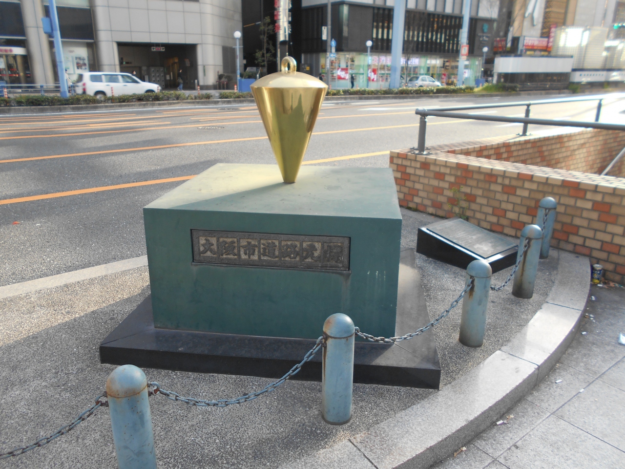 大阪梅田の国道1号線と新御堂筋の梅田新道交差点の北西角に建つ大阪市道路元標。金色のトロフィーの様なオブジェが台座に乗っています。この場所は国道1号線の終点かつ2号線の始点であと5つの道路の始終点となっています。繁華街の中であまり目立ちませんが探してみてください。