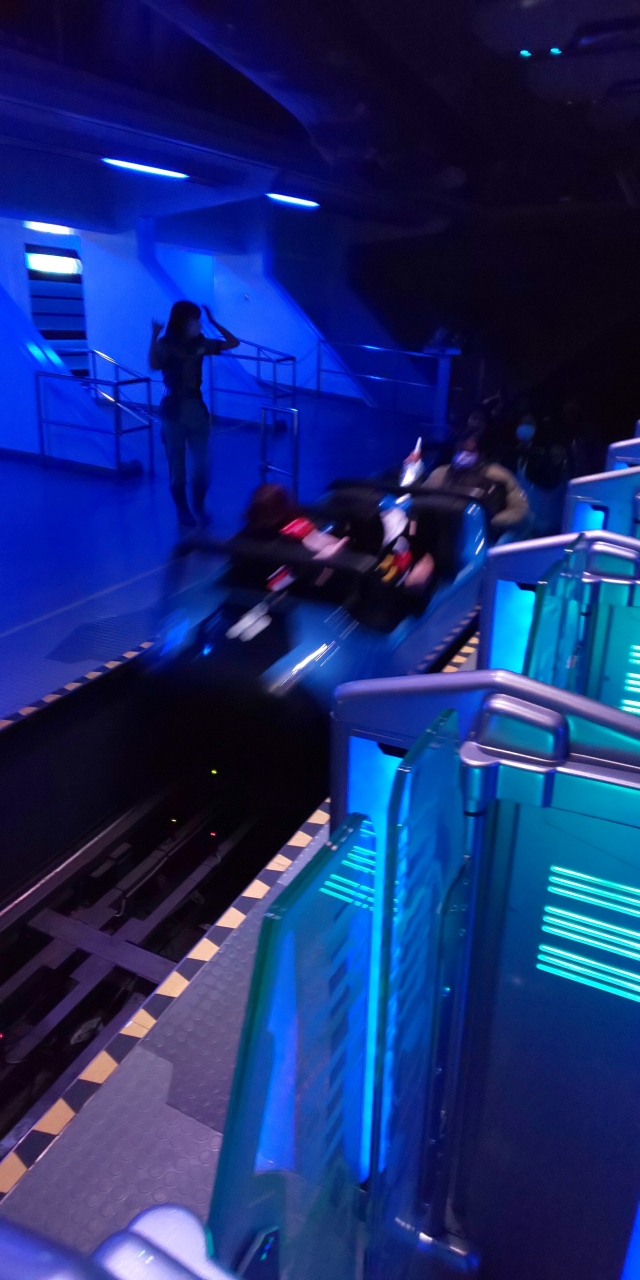 この日は入園制限で一日5000人の日だったこともあり、ほぼ並ばずに乗ることができました。待ち時間でも宇宙らしい近未来的な音楽が流れて気持ちが高まります!