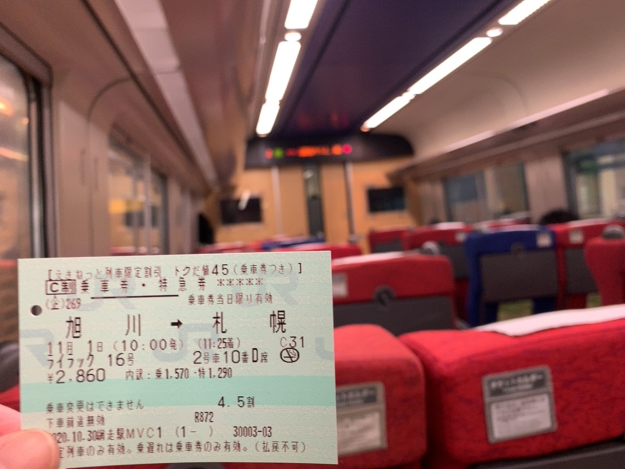 旭川からの移動だと、札幌が近づくにつれて、都会に近付いてる感があり、1人で勝手に興奮してました。 今回も、えきねっとのトクだ値で45% offできっぷを買えたのでかなりお得だったなーと思います。